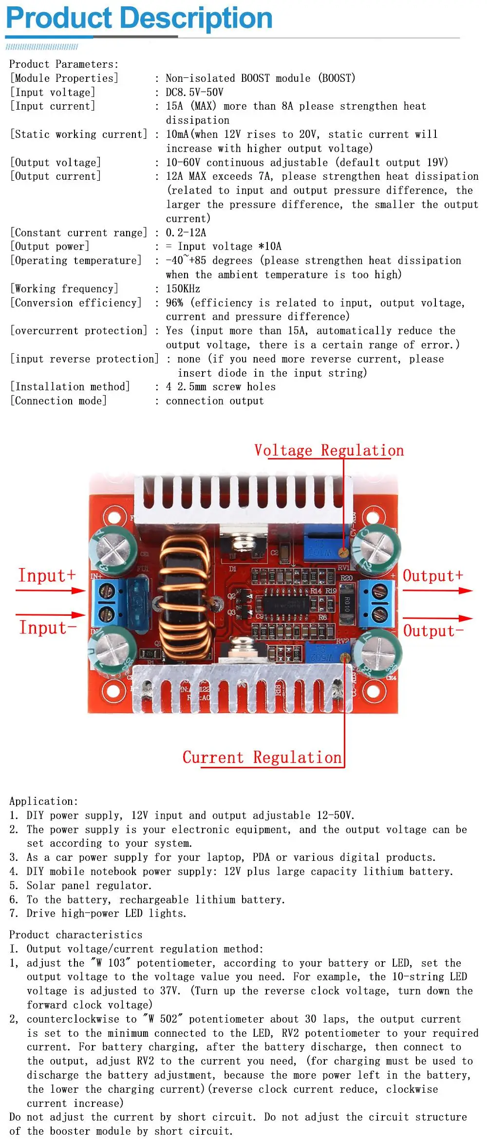 Lo compré y llegó. Lo probé hoy con una pequeña carga de 12v en la entrada, lo ajusté a 50v 3amp en la salida y simplemente se quemó. No lo recomiendo, creo que ni siquiera soporta 3amp, se quemó, ¡tendré que comprar otro modelo!