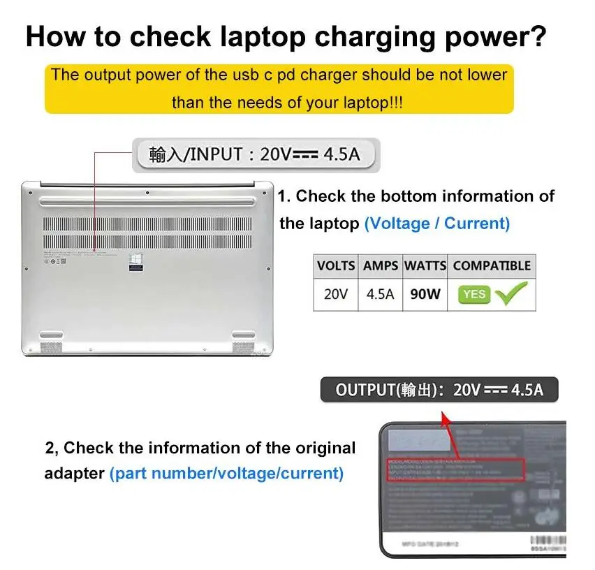 Puede consultar la parte posterior del cargador/banco de energía o el manual de instrucciones para encontrar su información relacionada, por ejemplo, si la información del cargador es "Salida: 20V=3.25A", la potencia de salida de este cargador es de 65W (20*3.25), para su computadora portátil de 65 W/45 W, pero no para alimentar una computadora portátil de 90 W
