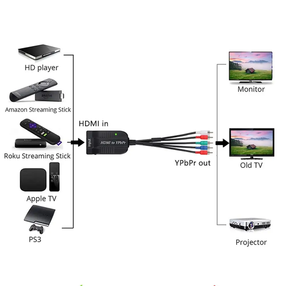 Este Convertidor es un convertidor de vídeo de HDMI a componente escalador (YPbPr-Male) que permite que el cine en casa moderno se integre sin problemas en los dispositivos analógicos y de audio digital más antiguos. Este adaptador conecta dispositivos de cine en casa de vídeo HDMI a componentes y señal digital. Con el HDMI a componente + adaptador de audio digital, los dispositivos de cine en casa heredados se pueden conectar fácilmente a cualquier pantalla YPbPr para una experiencia de audio y vídeo digital completa. Sirve para TVBOX,VHS,VCR, grabadoras de DVD, etc.