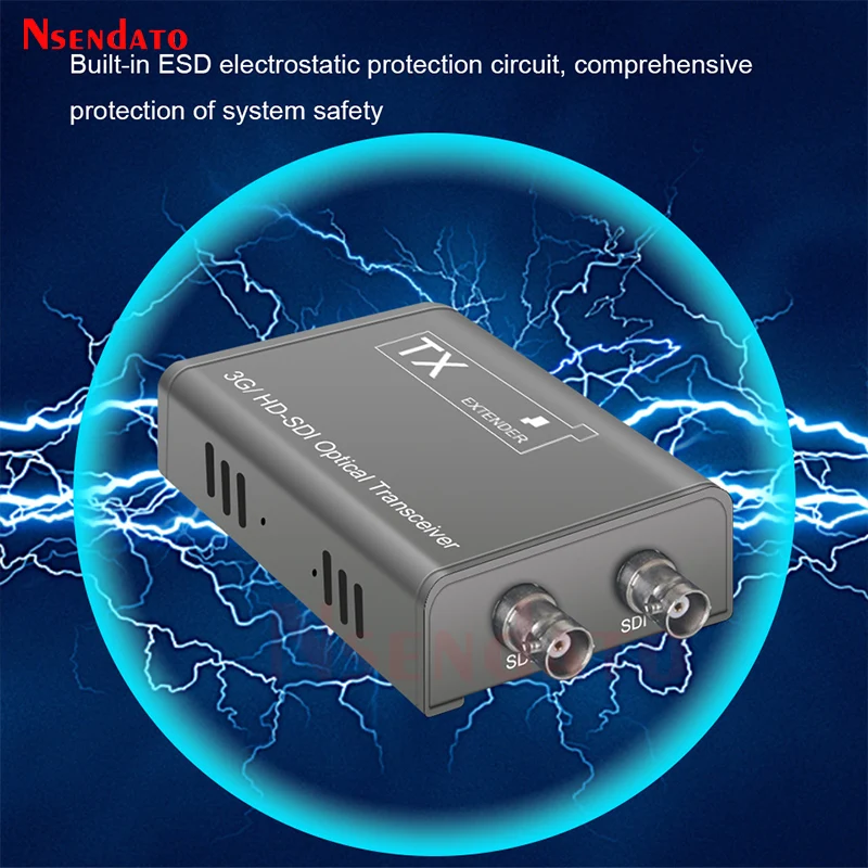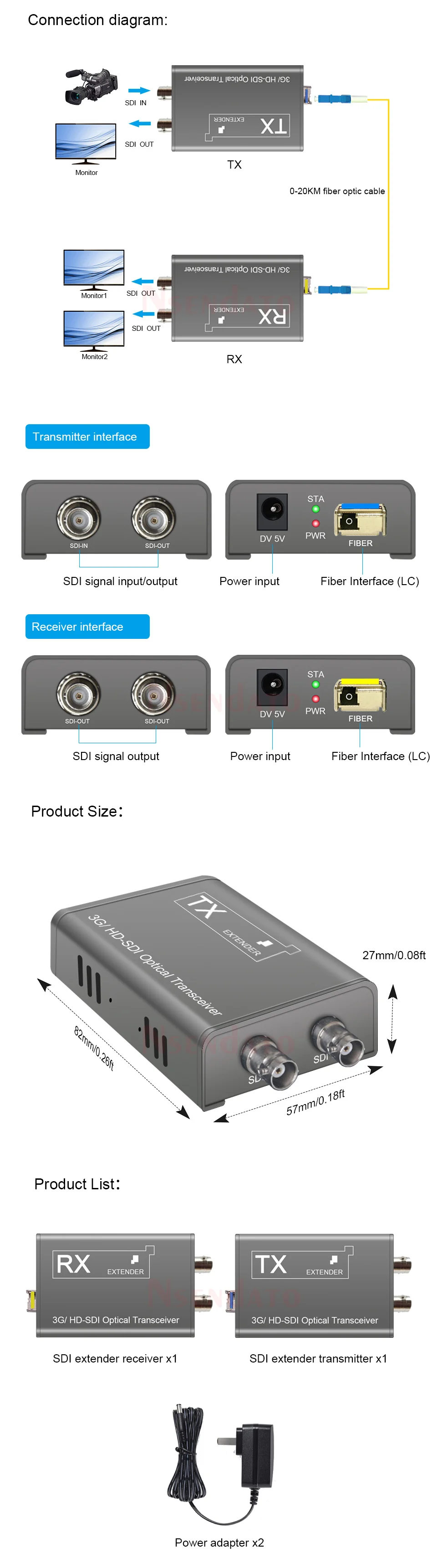 IntroducciónEl extensor de fibra transmite señales de vídeo 3G/HD-SDI a larga distancia a través de un único cable de fibra y admite la función de sincronización de audio integrada de 8 canales;Puede adaptarse a una variedad de entornos de aplicaciones complejos.El equipo tiene excelentes capacidades de transmisión y procesamiento de imágenes, lo que hace que la transmisión de la señal sea más fluida y estable.Es un modo de extensión de señal 3G/HD-SDI confiable, de alto rendimiento y eficiente.Características1. Transmisión de larga distancia de señales de audio y vídeo 3G/HD-SDI a través de fibra óptica, hasta 3-20 km (predeterminado 3 km)2.Resolución de señal de vídeo HD de hasta 1920*1080P@60Hz3. Admite toda la transmisión digital sin pérdidas, transmisión síncrona de audio y vídeo integrada de 8 canales4. Admite salida local, el extremo remoto admite salida síncrona bidireccional5. Admite PAL/NTSC, gran compatibilidad, capaz de identificar y configurar automáticamente varios modos de visualización6. Admite plug and play y conexión en caliente7.Sistema de ajuste automático incorporado, hace que la imagen sea suave, clara y estable8.Sistema de protección ESD incorporado9.Fácil de instalar, plug and playSolución de problemas1. La luz roja (PWR) no es brillante o el brillo es bajo. Verifique si el adaptador de corriente es normal.2.Cuando la luz verde TX (STA) no está encendida; Verifique la fuente de la señal; La luz verde permanece encendida indica un trabajo regular.3. La luz verde RX (STA) no está encendida, verifique si el módulo de fibra óptica de los contactos TX normalmente; La luz verde (STA) no está encendida cuando no hay señal del TX; La luz larga indica que TX y RX funcionan normalmente.4. Si no hay ninguna imagen en la pantalla, verifique si la pantalla selecciona la entrada del canal correctoEspecificaciónNormas técnicas: estándar SMPTEVelocidad de bits de vídeo: MÁXIMO 3,2 GB/segundoInterfaz: BNCEspecificación del cable de entrada/salida: ≤150 m (estándar de cable Babilir 1694A)Impedancia de entrada/salida de vídeo: 75ΩVoltaje de entrada/salida de vídeo: 1 Vpp; Min: 0,5 Vpp/máx.: 1,5 VppGanancia diferencial (10% ~ 90% APL): 1%Resolución SDI625/25 PAL, 525/29.97NTSC, 525/23.98 NTSC720P@50,[email protected],1080i@23/24/30/50/59,94,[email protected]/24/30/50/60Admite la especificación SDI270 Mbps (SD-SDI), 1,485 Gbps/M (HD-SDI)Mapeo SMPTE425M3Gb/s (3G-SDI)Serie SMPTE424M 3Gb/sInterfaz: (3G-SDI)Interfaz de fibra óptica: LCTipo de fibra: fibra única monomodoLongitud de onda: modo único 1310 nm; 1500 nmDistancia máxima de transmisión Predeterminado: 3 KM; Máx.: 20 KMAlimentación: CC 5 ~ 12 V/1 A.Consumo de energía: MÁXIMO 5WTemperatura: Temperatura de funcionamiento: -20℃ ~ +70℃Humedad: Humedad de funcionamiento: 0 ~ 90%Tiempo medio entre fallos:≥100000horasPaqueteExtensor SDI TX x1 Uds.Extensor SDI RX x1 Uds.Adaptador de corriente x2 piezasManual de usuario x1 unidad