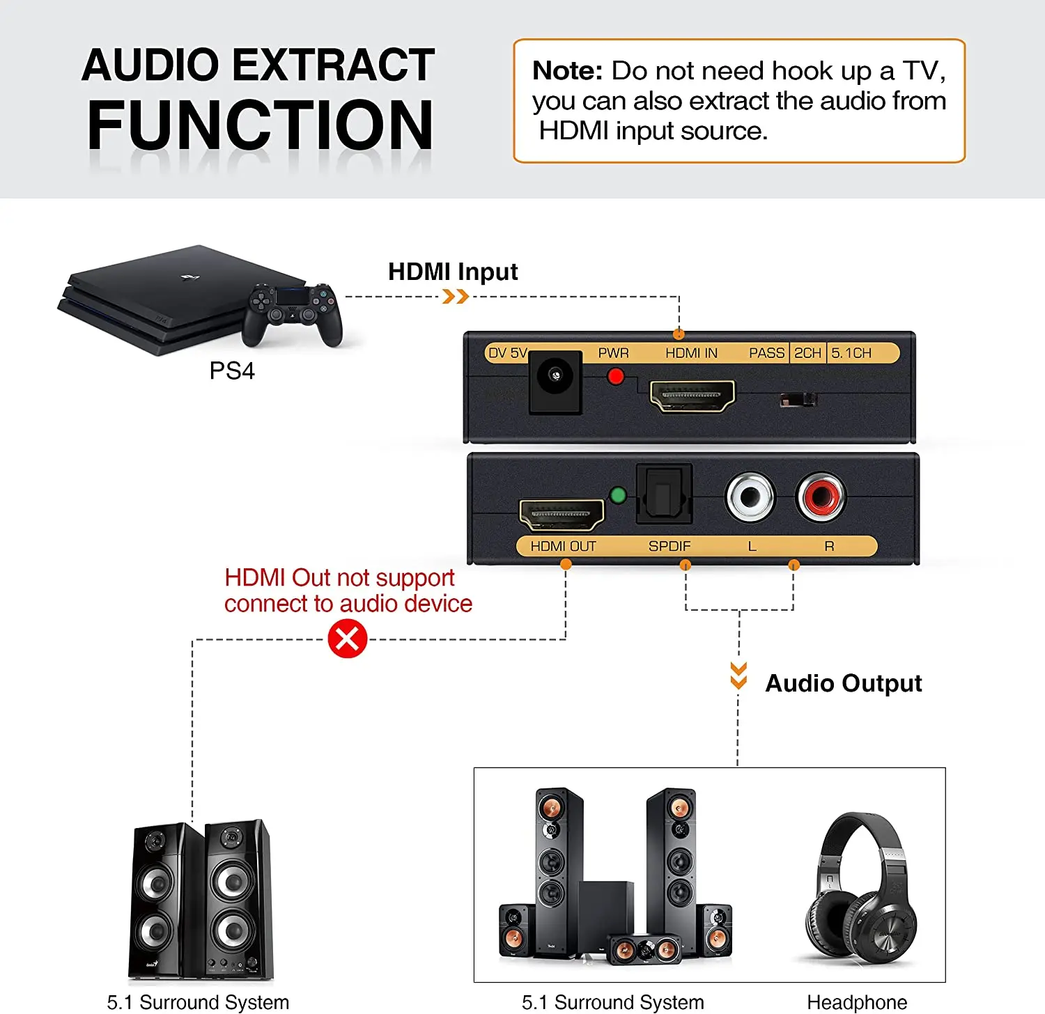 Cumple su función. Conecto la salida HDMI del pc a la entrada del extractor y de su salida HDMI a la smart tv, obteniendo audio 5.1 por la salida óptica del extractor. Justo lo que necesitaba.