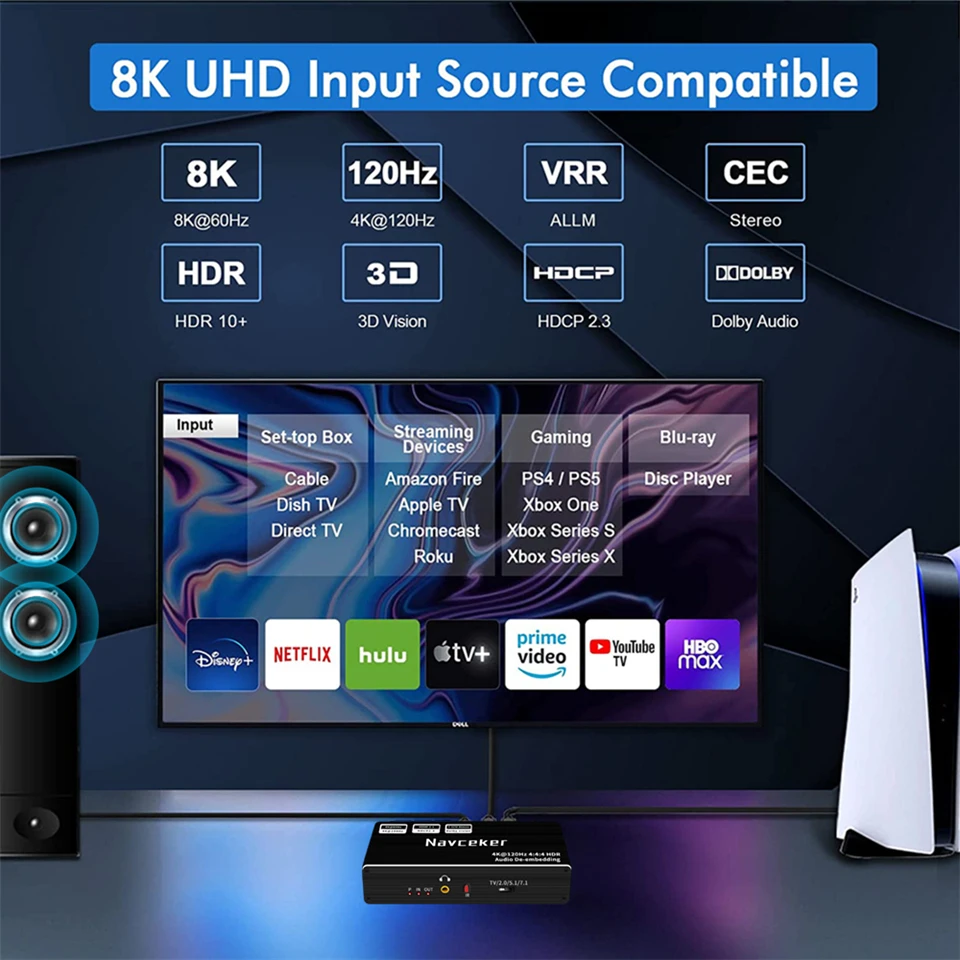 Navceker 4K 120Hz RGB 4:4:4 Extractor de audio HDMI 2.1 con 7.1 canales Atmos y Toslink óptico 48 Gbps HDMI Splitter de audio Apple TV XBox One PlayStation 5 Adaptador de solución de sistema de sonido