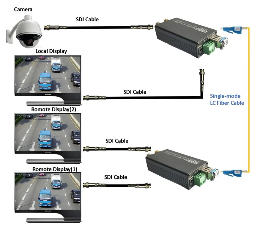 Aplicaciones de vigilancia multimedia de alta definición, a menudo necesitan ser HD sin comprimir fuente de señal de audio y video digital de transmisión de larga distancia. Pero la transmisión de larga distancia usando cable convencional, siempre hay una señal de salida pobre, vulnerable a los fenómenos de interferencia. La distancia de transmisión simultánea es corta, no puede cumplir con los requisitos para la transmisión de información multimedia de larga distancia y otras ocasiones, el uso de la señal HD/3G SDI de transmisión óptica HD/3G/R, resuelve completamente tales problemas, la distancia de transmisión de 1 m -20 km. Mientras tanto, la transmisión óptica con baja atenuación, ancho de banda, situación de interferencia, alto rendimiento de seguridad, tamaño pequeño, peso ligero, etc., tiene ventajas incomparables en términos de transmisión de larga distancia y entorno especial. Además, el equipo HD/3G SDI en las aplicaciones del sistema multimedia, lo que ahorra costos de construcción y la complejidad de la línea a seguir, pero también para garantizar un objetivo de alta calidad posible.