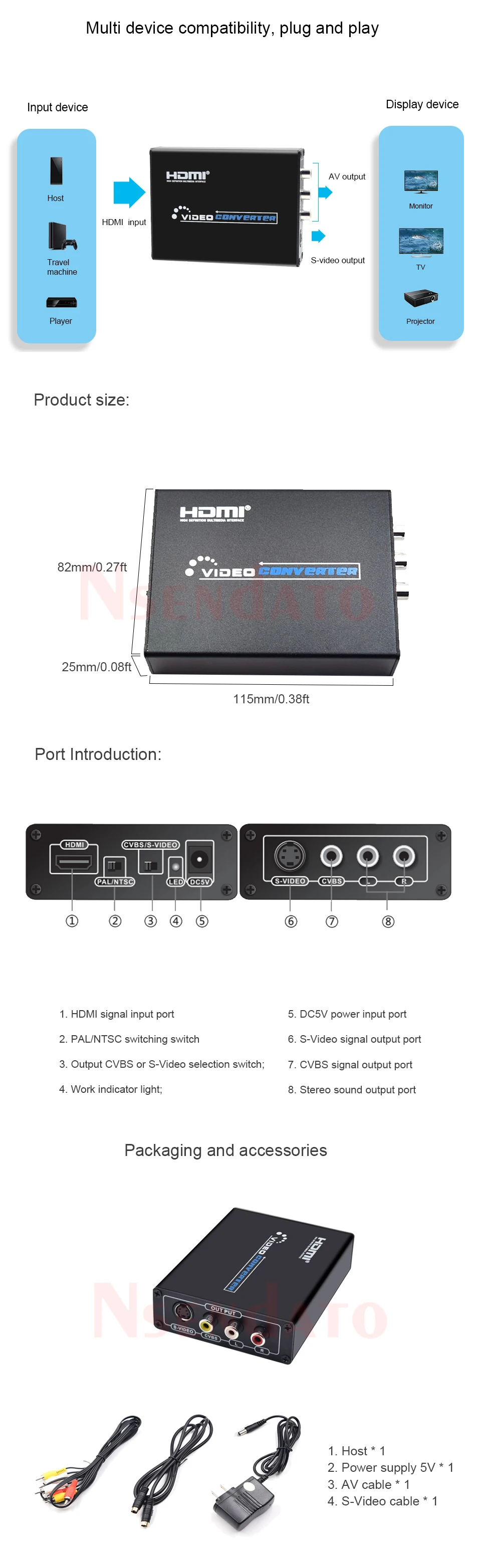 Nota: El enlace tiene dos modelos, uno es el convertidor de HDMI a s-video, el otro es el convertidor de s-video a HDMI, ¡por favor, selecciónelo de acuerdo con su solicitud!HDMI a S-videoIntroducciónEsta caja convertidora está diseñada para convertir HDMI a vídeo compuesto o S-Video. Permite que los dispositivos que solo están equipados con salida HDMI se conecten a la TV analógica. Se aplica principalmente en pruebas de equipos AV.CaracterísticasResolución de entrada HDMI: 480p(60Hz),576P(50Hz),720p(50Hz/60Hz),1080i(50Hz/60Hz),1080p(50Hz/60Hz);Señal de salida: vídeo compuesto (1.0Vpp),S-Video(Y:1 0Vpp,C:0.3Vpp); Sistemas de vídeo de 3 salidas: PAL/NTSC;Impedancia de vídeo de salida: 750;Compatible con HDMI1.3 y HDCP;Fuente de alimentación DC 5V;Contenido del paquete1 convertidor HDMI a RCA / S-Video1 Adaptador de CA (EU/UK/US/AU)1 cable RCA1 cable S-video1 manual de usuarioS-video a HDMIIntroducciónEl convertidor AV + a HDMI puede convertir la señal de formato 480I(NTSC)/576I(PAL) a la salida de señal HDMI 720P/1080P, también puede conectar la interfaz de entrada HDMI de alta definición, fácil de conectar el DVD, decodificador, reproductor HD, consola de juegos (, PS3,PSP,WII,XBOX360, etc.).Función:1). Interfaz HDMI de salida: conectar con TV de alta definición o proyector de alta definición.Formato de salida HDMI: 720P, 1080PFormato de salida de audio: Audio coaxial digital, audio estéreo analógico2) Interfaz de entrada CVBS: DVD, decodificador, PS2, WII, NGC y otros reproductores.Formato de entrada CVBS: PAL/NTSC_M/NTSC4.43/SECAM/1/1/23) Formato de entrada: Y:1.0Vpp,C:0.3Vpp.4). Interfaz de 3,5mm de audio: conectar con amplificador de audio analógico o interfaz de entrada de auriculares.Contenido del paquete1 convertidor HDMI a RCA / S-Video1 Adaptador de CA (EU/UK/US/AU)1 cable RCA1 cable S-video1 manual de usuario