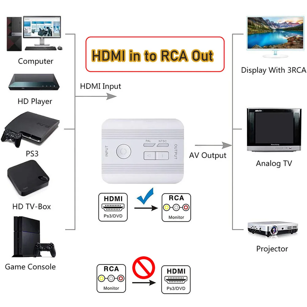 Este convertidor HDMI2AV está diseñado principalmente para conectar los últimos dispositivos HDMI A LA TV de las generaciones anteriores que viene sin puerto HDMI.