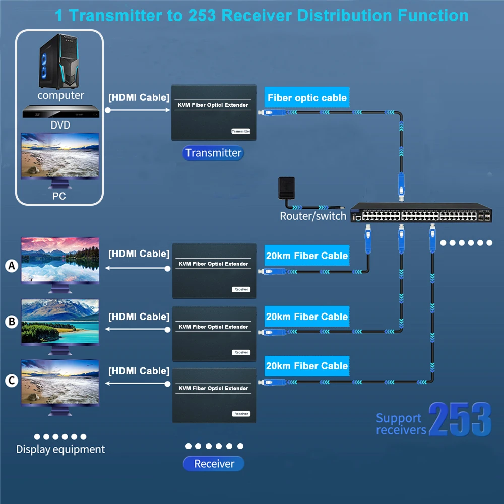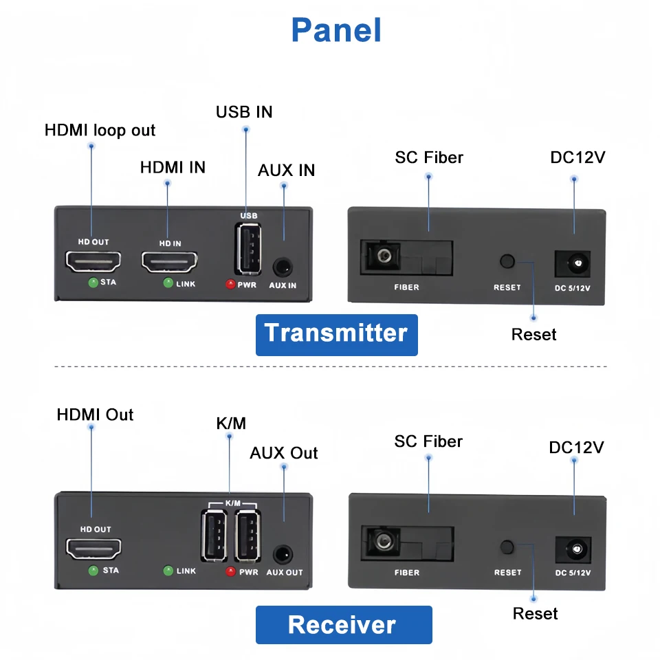 El extensor de fibra óptica HDMI Navceker proporciona una extensión de la señal de audio de vídeo HDMI a largas distancias sobre un cable de fibra óptica SC, admite alta resolución de hasta 1920x1080 a 60Hz. También es compatible con el control remoto KVM y la función de salida HDMI. El extensor se puede utilizar para una amplia gama de aplicaciones que requieren transmisión de larga distancia de alta resolución con alta calidad por su buena estabilidad y potente seguridad.