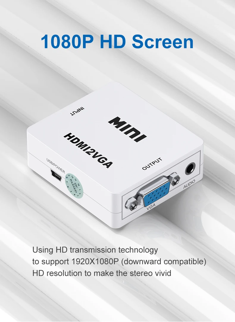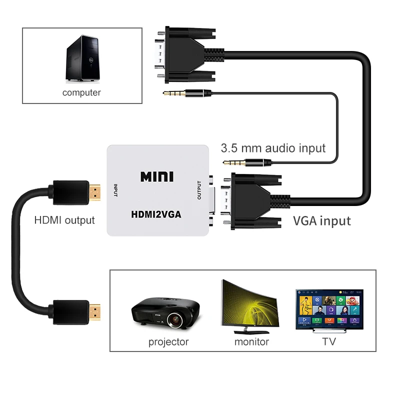 Si Desea ver su PC de escritorio o aplicaciones en su HDTV, pero carece de los puertos necesarios, Este convertidor es lo que necesita. Simplemente conecte un cable de video VGA estándar al puerto de entrada del convertidor junto con un cable de audio normal de 3,5mm y luego conecte un cable HDMI del convertidor a su televisor. Disfrute de una adición práctica y sencilla a su sistema AV con este dispositivo, que es fácilmente ocultable pero capaz de audio y vídeo claros y de alta definición compatibles con HDMI.