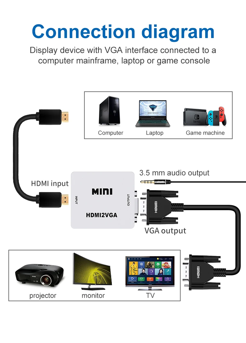 Se utiliza para convertir video VGA y señal de audio analógica de 3,5mm en su computadora a señal compatible con HDMI y mostrarla en la pantalla grande de HDTV Plug and play
