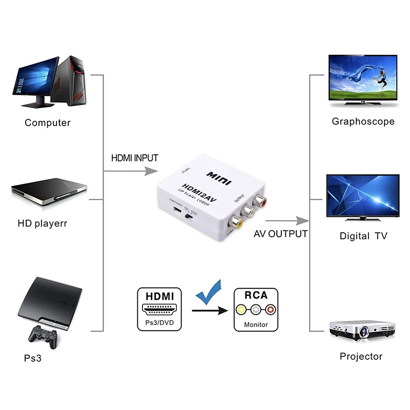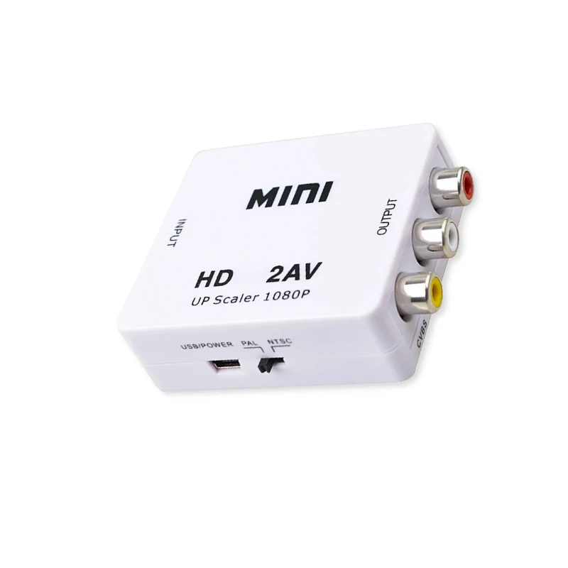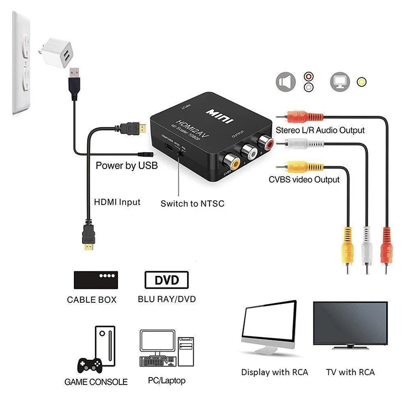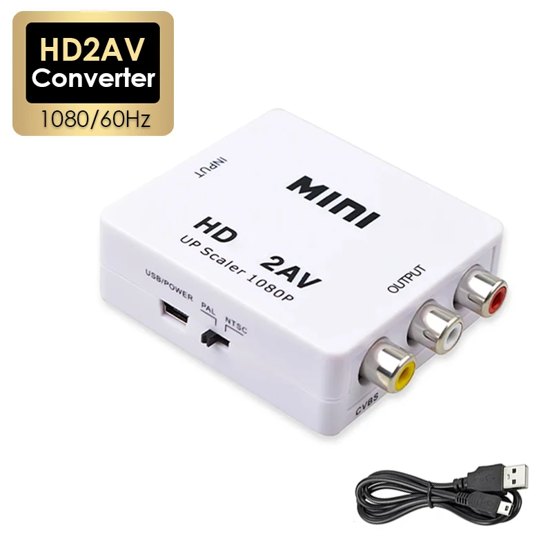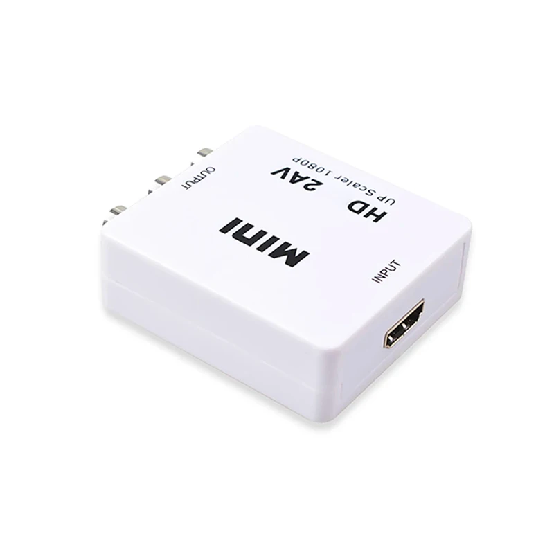 Convertidor compatible con HDMI a RCA AV/CVBS L/R Audio Video Set Top Box Up Scaler 1080P MINI HD2AV Soporte NTSC PAL Salida HD a AVIntroducción: Este convertidor A/V compatible con HDMI A compuesto proporcionará una conexión RCA Y/R/W estándar desde cualquier señal compatible con HDMI. Ideal para alimentar un decodificador o dispositivo multimedia en un sistema de distribución A/V existente para clubes o negocios, también es útil para situaciones en las que tiene cables A/V existentes y no es necesario actualizar a una ruta de señal totalmente compatible con HDMI. Fuente de alimentación incluida (cable USB).
