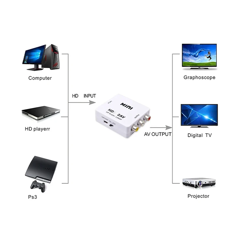 Características: Nuevo y de alta calidad. Entrada: HDMI compatible tipo A hembra Salida: RCA amarillo/rojo/blanco. Formato de entrada compatible con HDMI: 480p / 576p / 720p / 1080i / 1080p Formato de salida A/V: PAL 576i o NTSC 480i seleccionable Plug and play, no necesita controlador. Tamaño: 6cm x 5,5 cm x 2cm