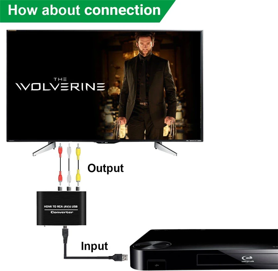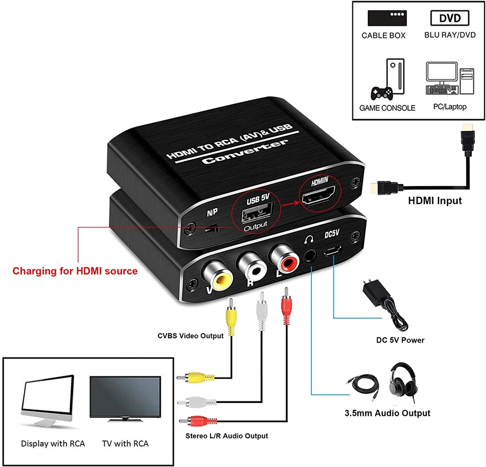 Convierte la señal de vídeo HDMI en señal CVBs(AV) normal (definición estándar 480i, 576i), disponible para TV Stick, Roku, Chromecast, Apple TV, PC, ordenador portátil, Xbox, HDTV, DVD-negro, etc.