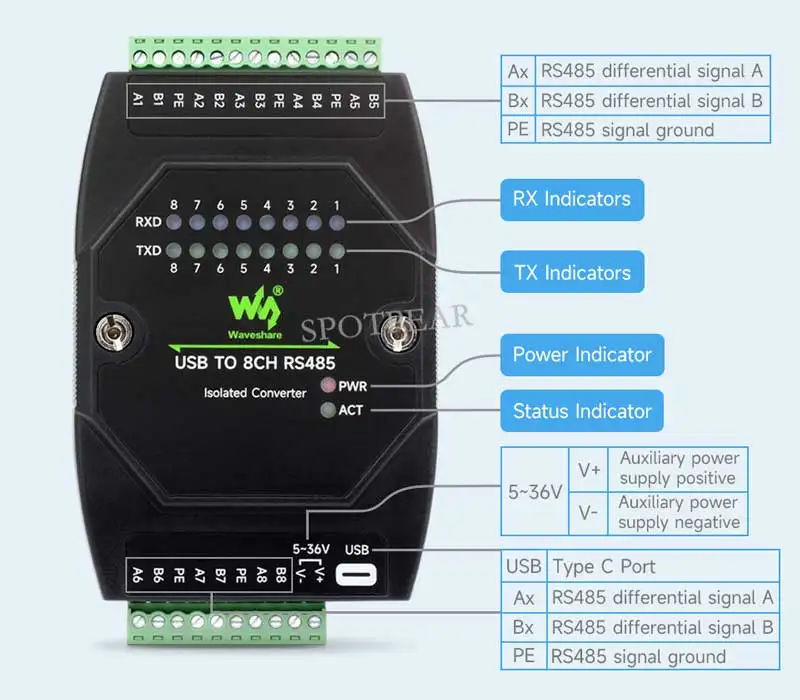 [] Admite fuente de alimentación directa a través del puerto tipo C, con terminal de tornillo de amplio voltaje reservado de 5 V ~ 36 V CC para entrada de alimentación auxiliar
