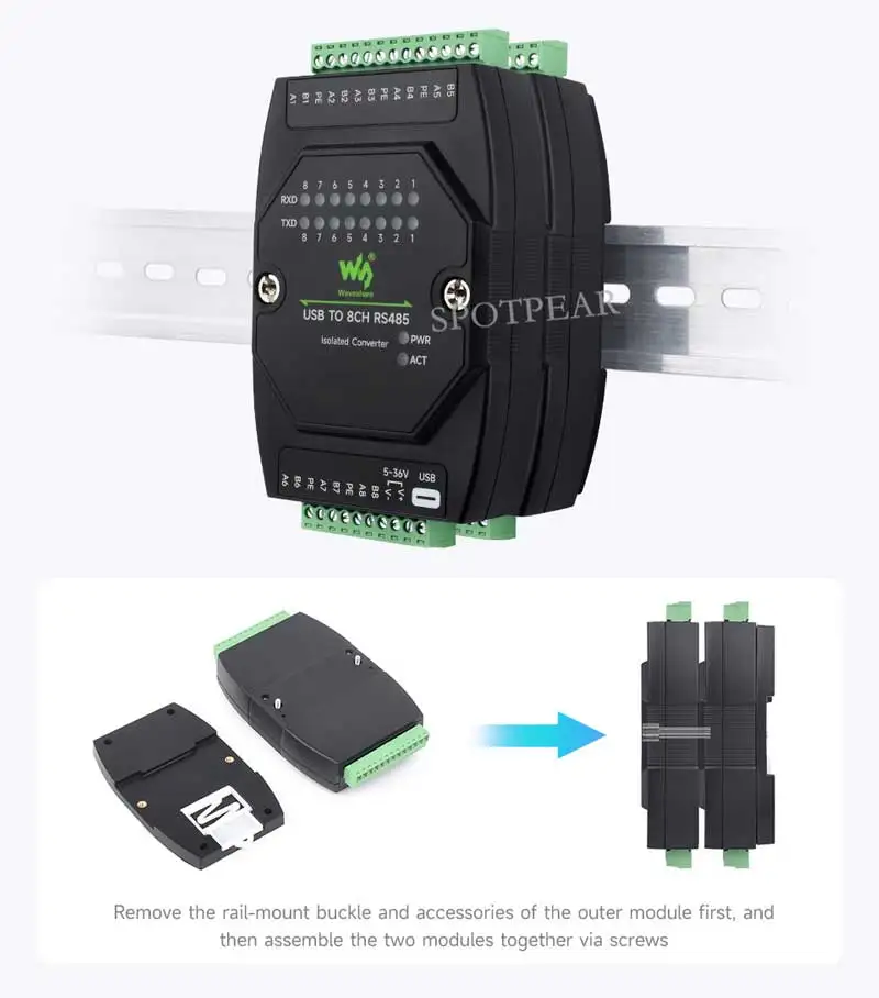 Comprar Convertidor Industrial UART USB a 8 canales RS485 aislado, multiOS estable, Compatible con riel estándar de 35mm y instalación apilada