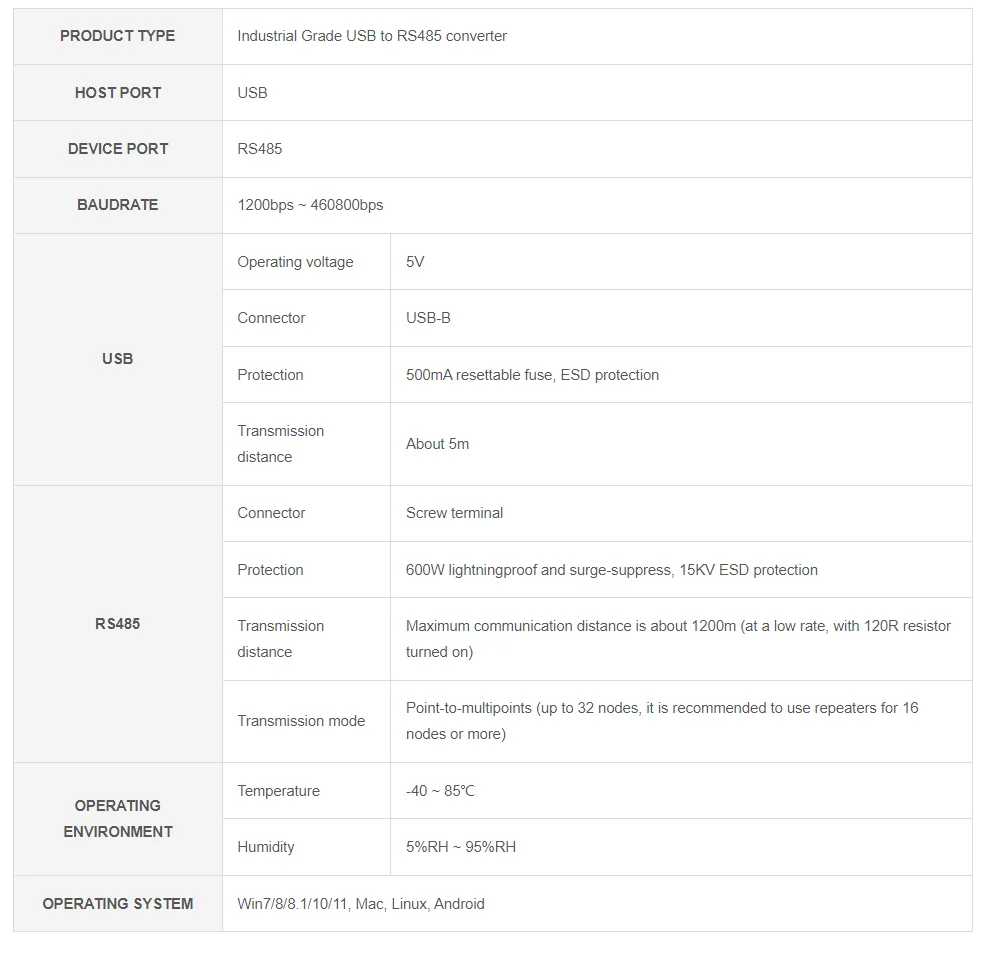 The USB Signal Can Be Converted Into 4 Balanced Differential RS485 Signals And The Transmission Rate Is Stable. The Reliable Speed Is 1200~460800bps, The Transmission Distance Is About 1.2km For RS485, And About 5 Meters For USB.