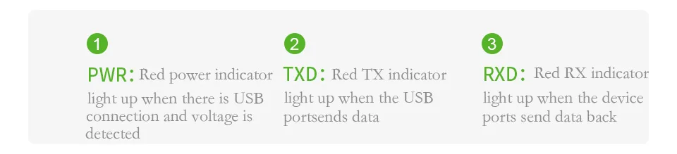 TXD: indicador TX rojo, se ilumina cuando el puerto USB envía datos