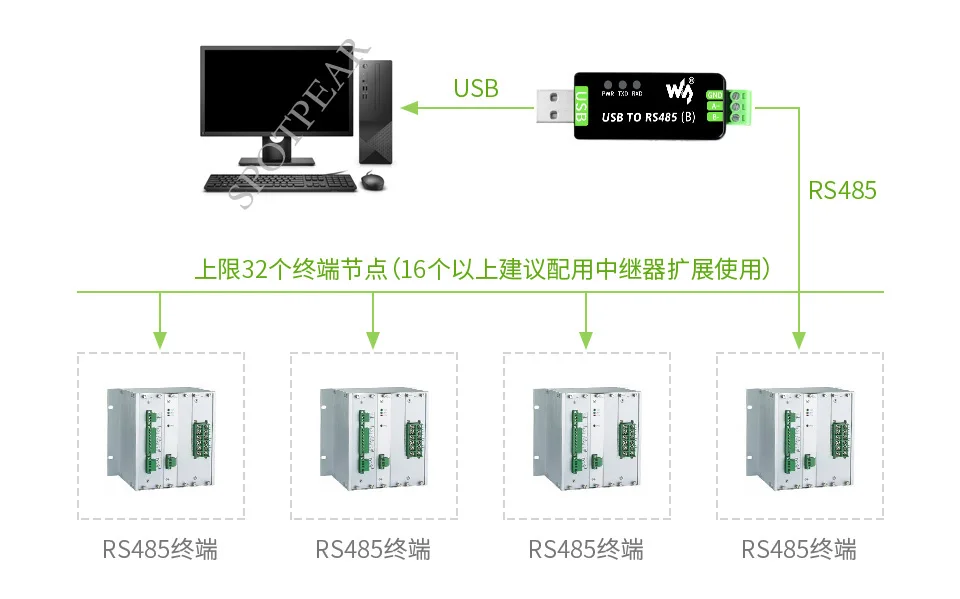 Puede convertir señales USB en señales RS485 diferenciales balanceadas, con velocidad de transmisión estable, velocidad confiable de 300 bps ~ 3 Mbps, distancia de transmisión de RS485 de aproximadamente 1200 metros y USB de aproximadamente 5 metros.
