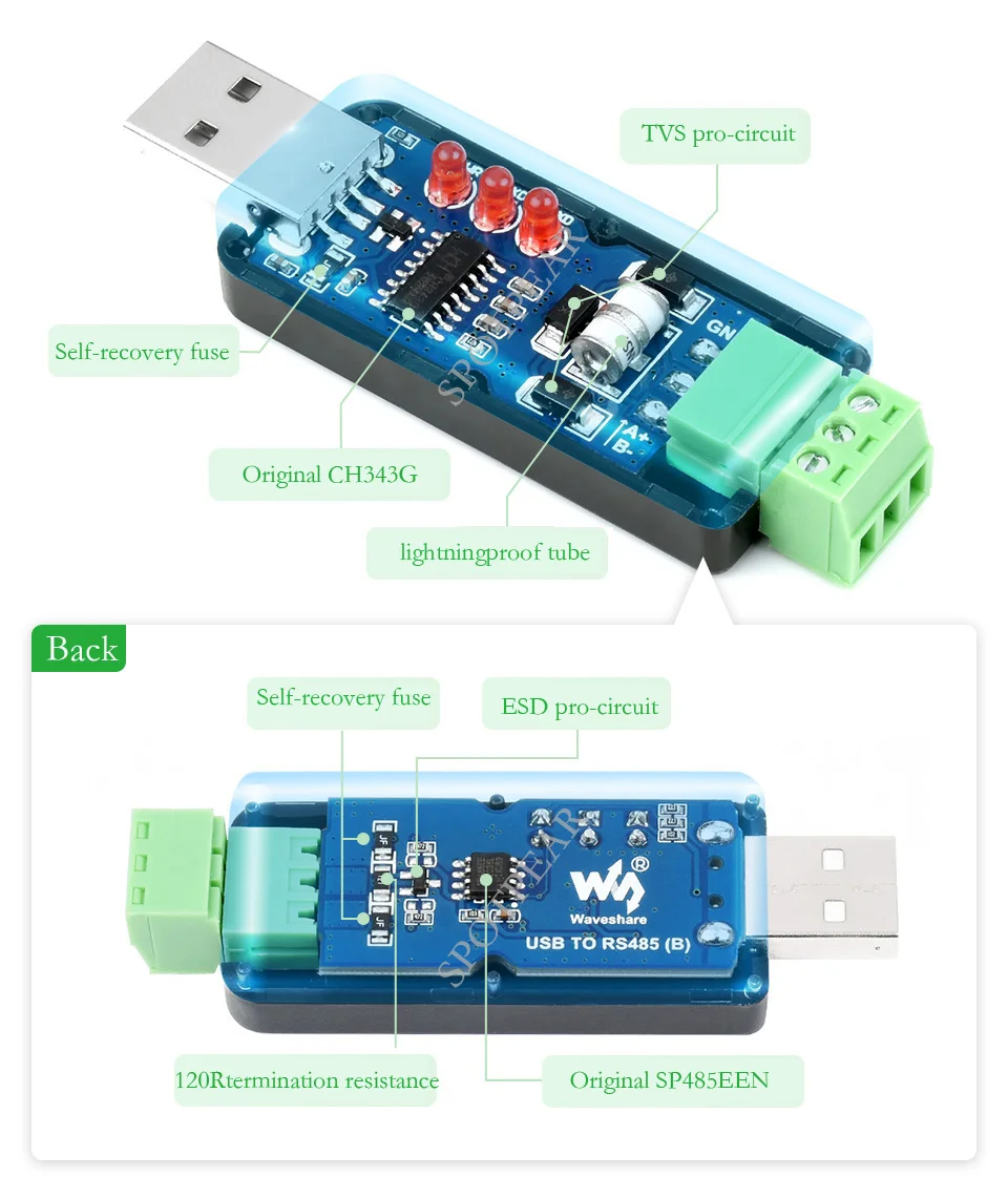 Este es un convertidor bidireccional industrial de USB a RS485 con CH343G y SP485EEN originales en el interior. Cuenta con circuitos de protección integrados como a prueba de rayos, fusible reiniciable, protección ESD y Diodo TVS, etc. Es bastante pequeño en tamaño.