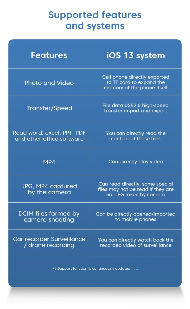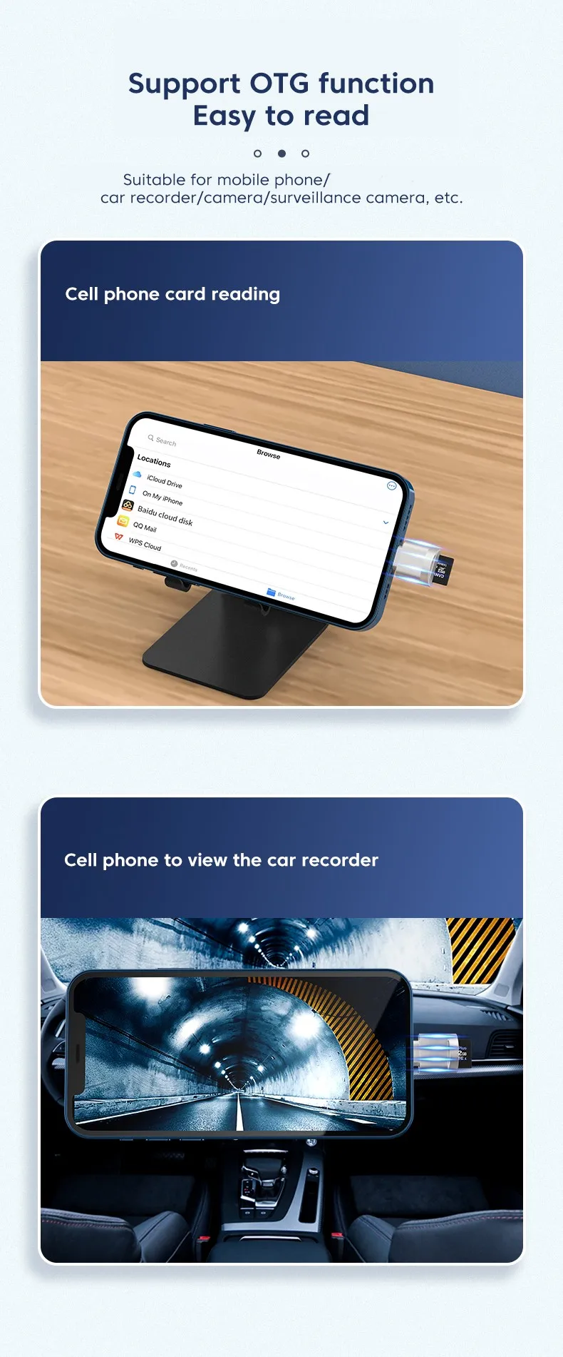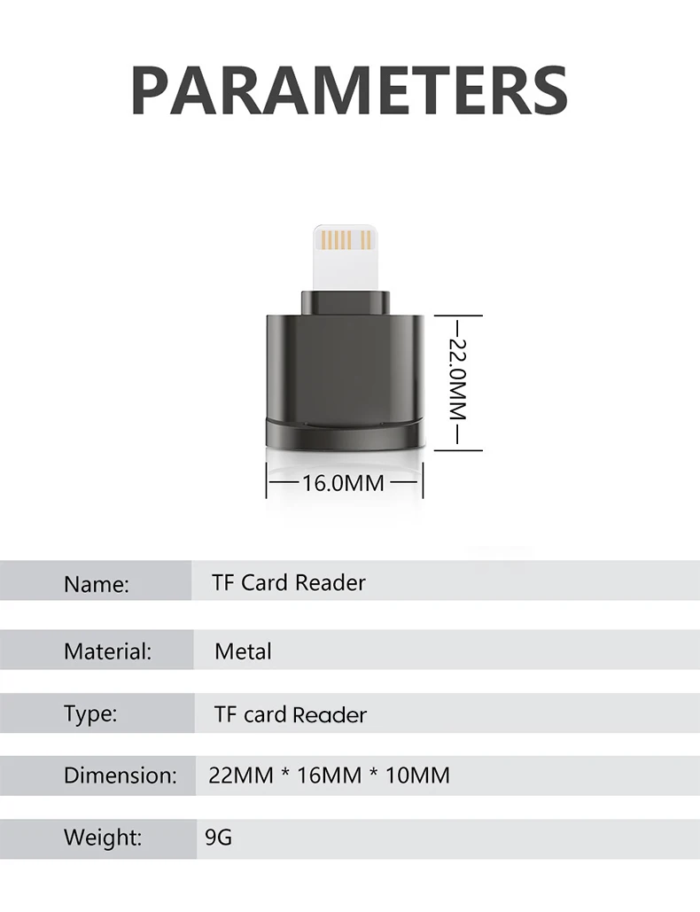 Adecuado para Apple iOS 13 14 15; Admite tarjetas TF de hasta 512G. Admite lectura, transmisión y almacenamiento de fotografías en álbumes de teléfonos o tabletas, vídeos en formato MP4 y documentos en formato Word. El sistema Apple solo admite reconocimiento de formato FAT32 o EXFAT
