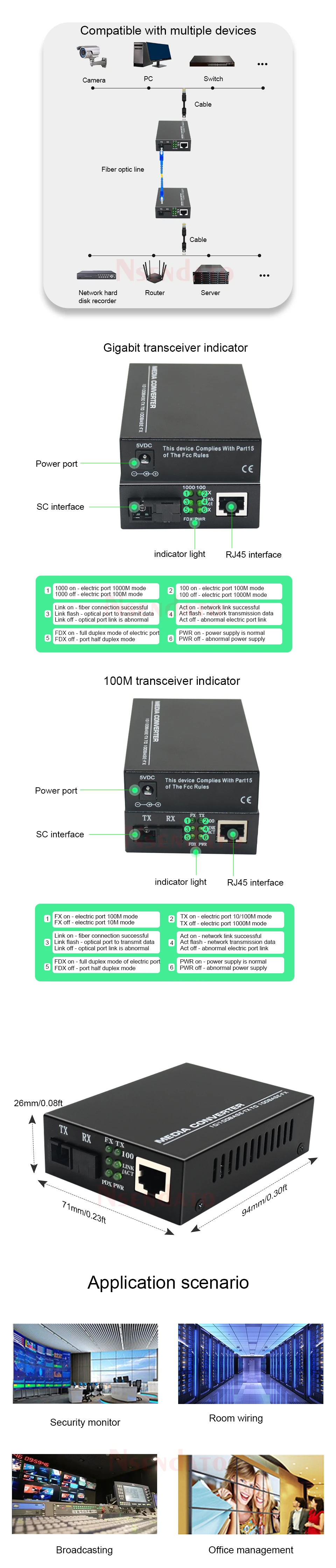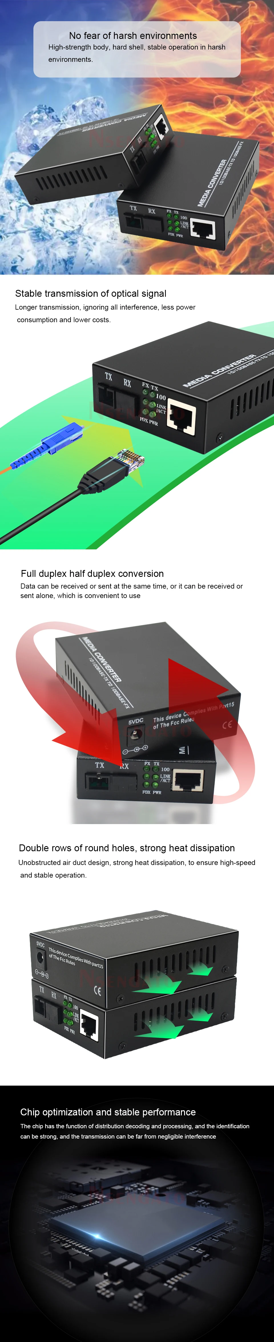 Notado:1. La descripción para el modelo de 100 Mbps, pero tenemos dos opciones para seleccionar, una es de 100 Mbps, una es de 1000 Mbps, por lo que puede seleccionar cuál es su solicitud.!2, contáctanos si tienes algún problema, haremos todo lo posible para ayudarte después de recibir tu mensaje.Descripción general:Nsendato de transceptores de fibra óptica Ethernet adaptables bidireccionales 10/100M/1000M, que utiliza el último chip IC más 113GH, módulo transceptor óptico bidireccional de fibra única de alta calidad (nuevos fabricantes), rendimiento estable y excelente calidad.Para telecomunicaciones, radiodifusión, tráfico de datos de redes de fibra óptica de banda ancha y la necesidad de mejorar el rendimiento y un entorno de red de alta confiabilidad.Característica:1. Un puerto RJ45 y un puerto óptico SC de una sola fibra, para lograr la conversión de señal óptica entre par trenzado TX de 10/100 base (Ethernet) y FX de 100 bases (fibra óptica);2.La fibra óptica central se puede completar con una sola transmisión de señal en comparación con el modo de transmisión de datos de fibra óptica dual para mejorar la cantidad duplicada;3. Cumplimiento de los estándares IEEE802.3 10Base-T e IEEE802.3u 100Base-TX, 100Base-FX;4.Tiene capacidad adaptativa de 10M/100M;5.La interfaz Ethernet puede dirigir de forma adaptativa la conexión de línea/cable cruzado;6. Admite modo full/half dúplex;7. Admite control de flujo dúplex IEEE802.3X y control de flujo de contrapresión semidúplex;8. Admite la función de prevención de tormentas de transmisión;9.1916 bytes admite fotogramas de datos grandes (opcional);10.Circuito de protección contra rayos incorporado, que puede reducir en gran medida el daño causado por la inducción de rayos;11.UTP hasta 100 metros; la fibra monomodo más larga de 100 km;12.Hay seis indicadores LED: Power, TX 100, TX Link/ Act, FX 100, FX Link/ Act, FDX/Col; fácil monitorear el estado de funcionamiento del transceptor y determinar la causa de la falla;13.Hay fuentes de alimentación externas e internas de dos tipos: fuente de alimentación conmutada AC100 ~ 265V / DC5V;Para el medio ambiente:Para telecomunicaciones, radiodifusión, tráfico de datos de redes de fibra óptica de banda ancha y la necesidad de mejorar el rendimiento y el entorno de red de alta confiabilidad.El paquete incluye:Convertidor de medios EthernetAdaptador de corriente