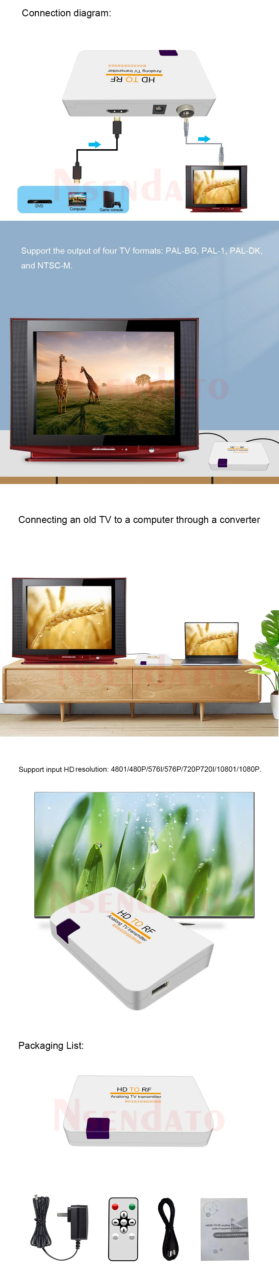 Característica Toda la familia comparte una computadora, viendo películas y jugando en Internet. La popularización de HD para brindar un gran disfrute visual.Quizás en alguna ocasión necesite cambiar las señales HD de DVD/decodificador a señales RF.Su PC/DVD/decodificador con HDMI puede reproducir en un televisor antiguo sin HD.También puede demostrar sus documentos multimedia desde su computadora portátil a su audiencia a través de un Typroyector de pantalla grande. El convertidor de RF puede ayudarlo fácilmente a realizar la conversión de señales HD en señales de RF. Características de rendimiento: 1.Una entrada de señal HD 2. Una salida de RF, la frecuencia de la señal de salida del televisor es de 61,25 MHZ. 3. Con el control remoto, puede ajustar la pantalla de salida hacia arriba y hacia abajo y la amplitud, brillo, contraste y croma ajustables. 4. Formatos de imagen y audio de salida opcionales PAL BG/PAL l/PAL DK/NTSC M 5. Una interfaz de alimentación CC de 5 V 6. Resolución de soporte de señal HD de entrada: 480I/480P/576I/576P/720P/720I /1080I/1080P 7.Soporte para los siguientes sistemas: soporte para TV analógica estándar global 8.La transmisión de señal de ultra larga distancia se puede realizar mediante el cable televisor de circuito cerrado y puede reemplazar el cable RF.Con HD, coloque su computadora con salida HD, o imágenes de DVD o decodificador en la pantalla para reproducir en otra habitación o más lejos del televisor para ver.Y HD fácil de resolver, no puede ser transmisión de larga distancia. 9. Admite el modo de visualización OVERSCAN y UNDERSCAN 10. Cómodo de llevar porque es ligero, delgado, corto y pequeño.