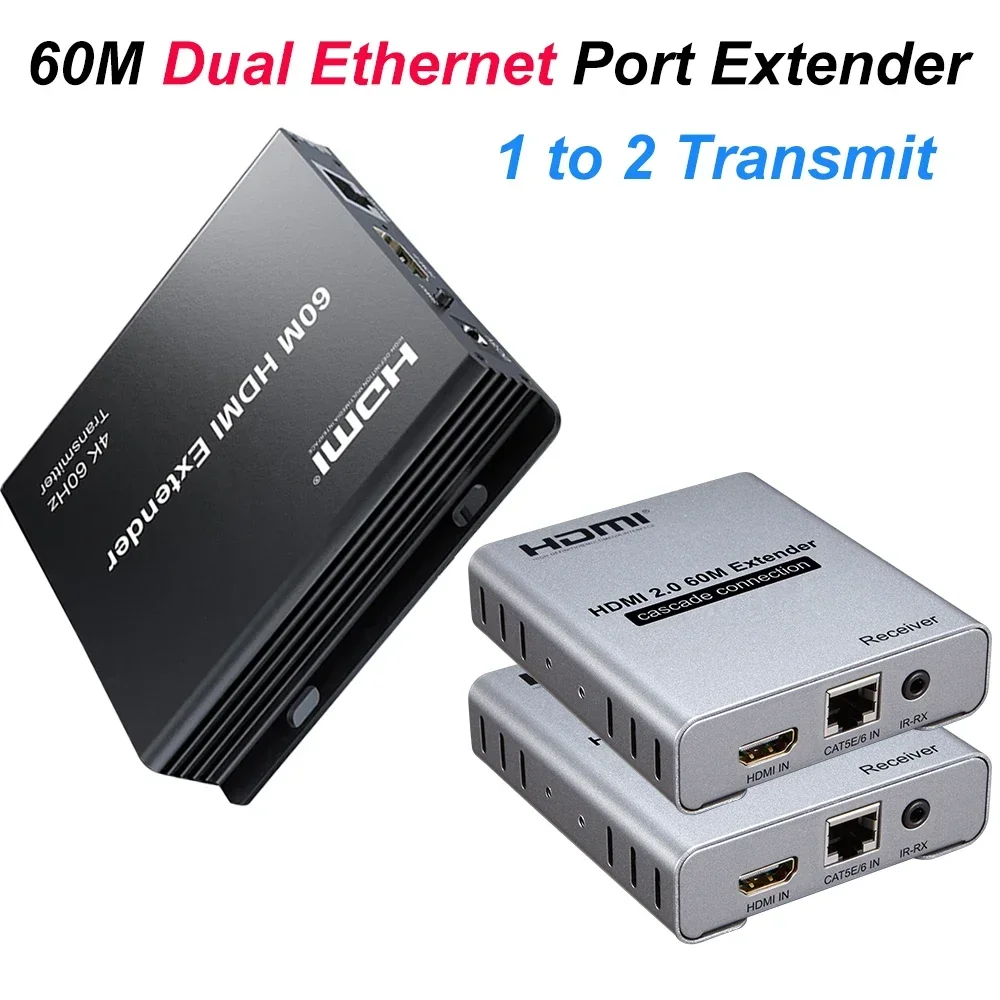 Comprar Convertidor de puerto Ethernet Dual, 4K, 60hz, 60m, HDMI a través de Cable de red Rj45 Cat6, transmisor de Audio y vídeo, receptor, conexión en cascada