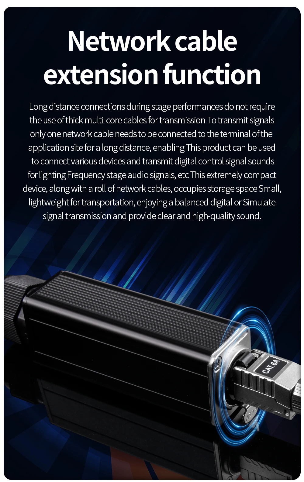 Las conexiones de larga distancia durante las representaciones teatrales no requieren el uso de cables gruesos de varios núcleos para la transmisión. Para transmitir señales, solo es necesario conectar un cable de red al terminal del sitio de aplicación durante mucho tiempo distancia, habilitar Este producto se puede utilizar para Conecte varios dispositivos y transmita sonidos de señal de control digital para señales de audio de escenario de frecuencia de iluminación, etc. Este dispositivo extremadamente compacto, junto con un rollo de cables de red, ocupa espacio de almacenamiento pequeño, ligero para el transporte, disfruta de una transmisión de señal digital equilibrada o simulada y proporciona un sonido claro y de alta calidad.