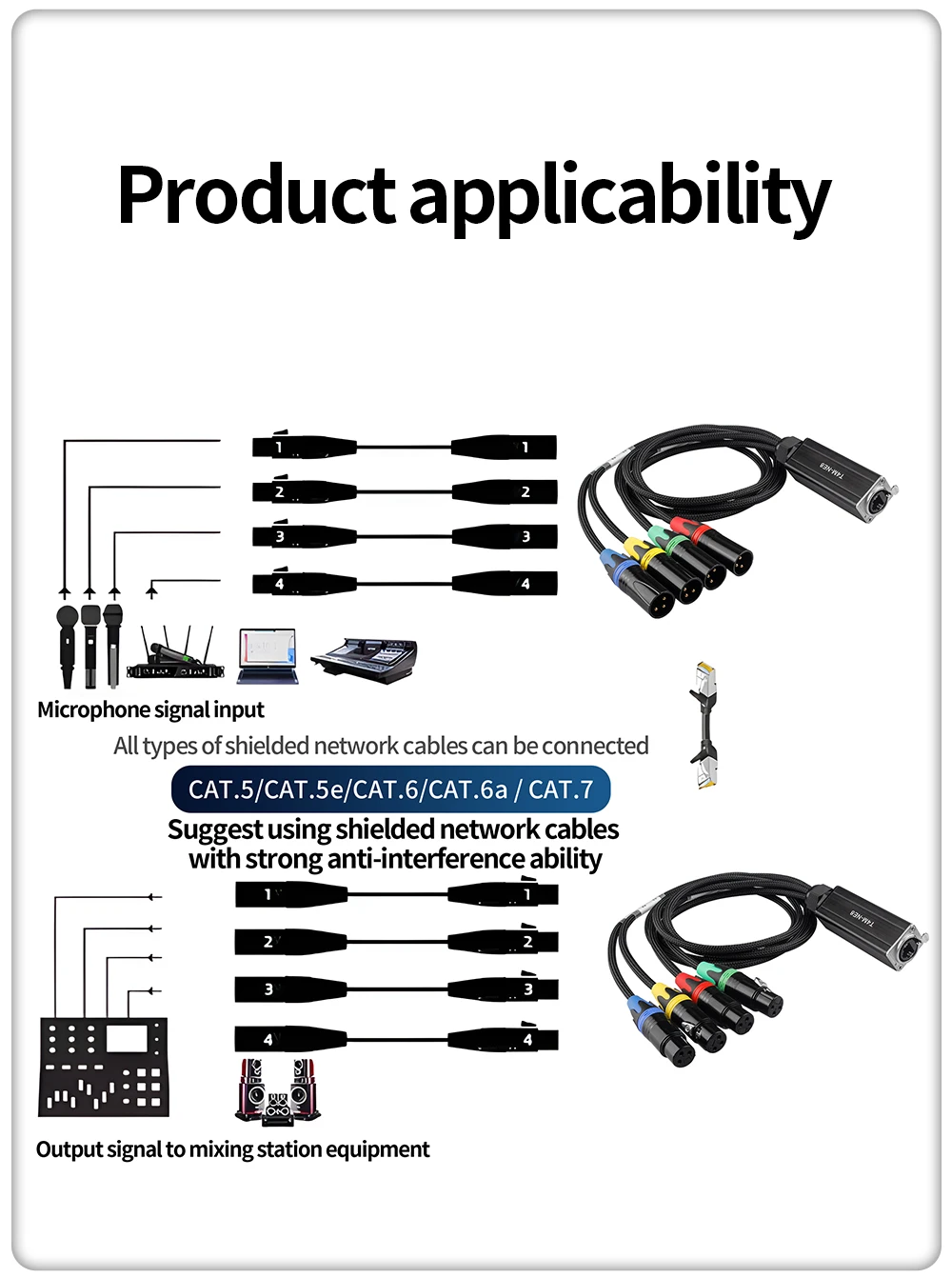 Convertidor de red RJ45 CAT5 con blindado a 4 canales 3Pin XLR conector macho/hembra Cable receptor de red múltiple para altavoz