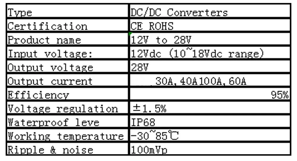 Más características incluyen:Convertidor DCDC de 12 V (10 V CC ~ 18 V CC) a 28 V CC Potencia de salida de 28 V, 100 A, 30 A, 40 A, 60 A