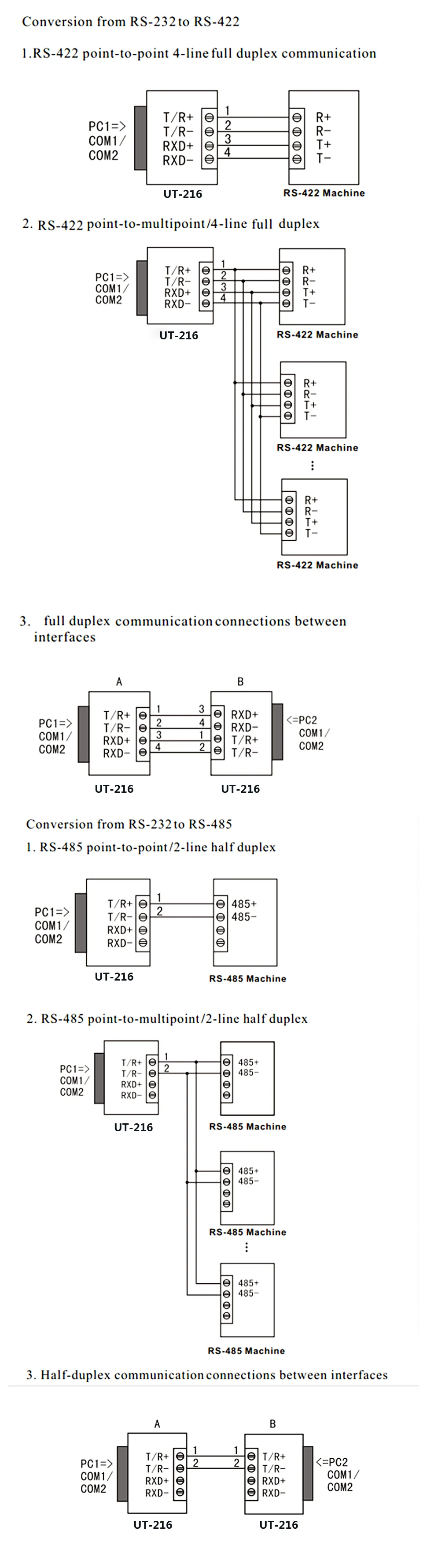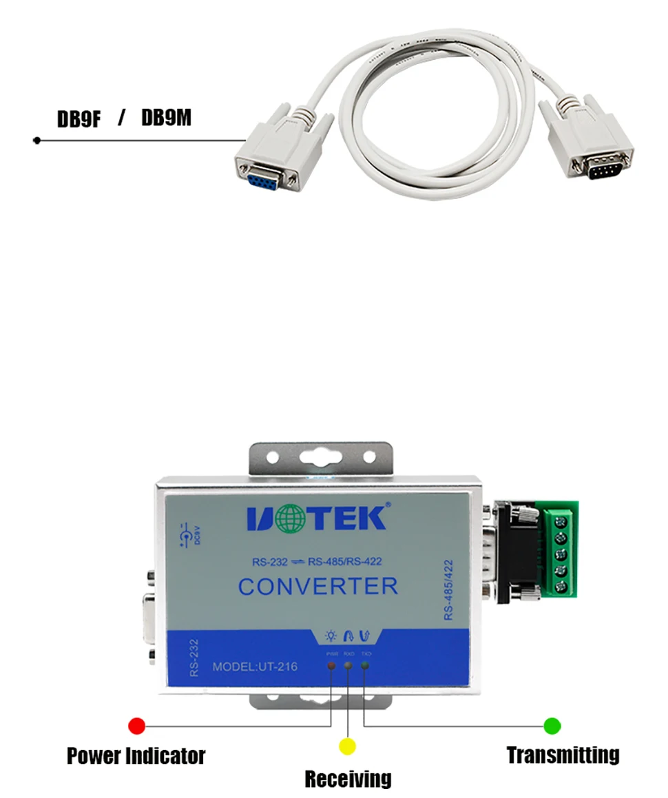 ... El conector hembra DB9 se conecta con el puerto estándar de la RS-232C; el conector macho DB9 se usa el conector de la hembra del puerto DB9. El conector es el macho DB9. 2. 2. 3. 3. 3.Este convertidor tiene Conversión de recepción y transmisión automática de retardo cero incorporada y dirección de flujo de datos de control automático de circuito de E/S único sin ninguna señal de enlace (RTU, DTR); no necesita Ajuste de cable de puente para modo Full Duplex (1/2 ") y Half Duplex (1/2") (1 "), Plug & Play. Es compatible con el software y hardware de comunicación actual, sin necesidad de configurar el modo de trabajo anterior que se basa en la función de la red.El convertidor de UT-216 proporciona conexión para comunicación punto a punto y punto a multipunto. Para el modo de punto a multipunto, cada convertidor puede conectar 32 conjuntos de dispositivos con una tasa de baudios de 300-115,2 Kbps, o un dispositivo en el que se pueden conectar a un número de dispositivos de 1/2 ". Los indicadores de potencia y flujo de datos indican el estado de funcionamiento.
