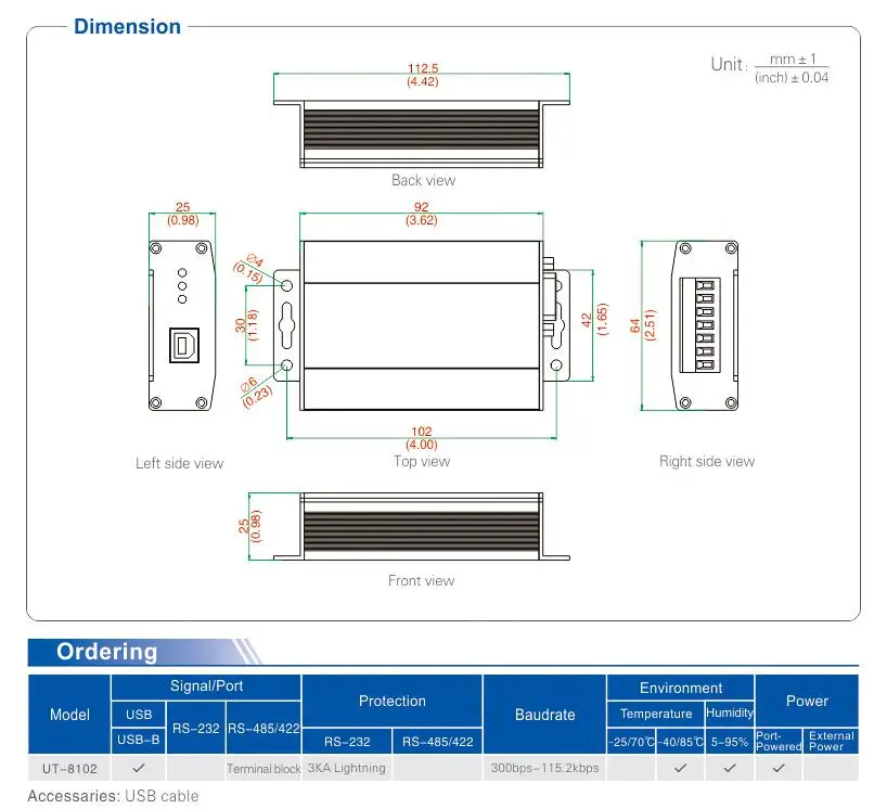 El convertidor de UT-8102 proporciona conexión para la comunicación punto a punto. La velocidad de transmisión puede ser 300-115.200bps. Los indicadores de potencia y flujo de datos indican el estado de funcionamiento.