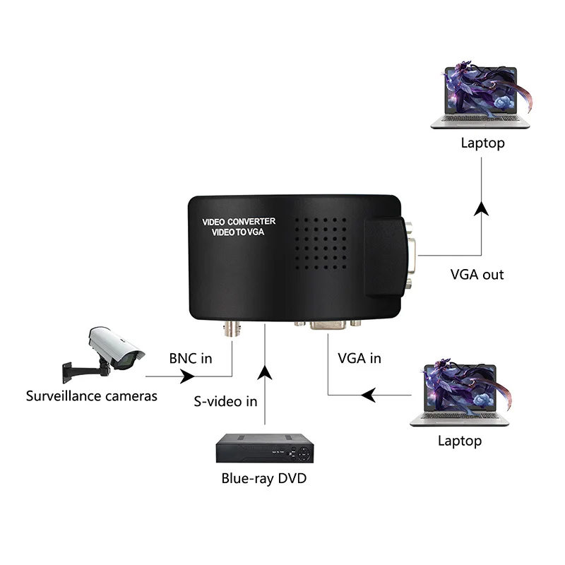 Este convertidor de vídeo BNC a VGA puede admitir imágenes de vídeo de alta resolución (hasta 1920 x 1080).El convertidor de vídeo puede proporcionar imágenes de alta calidad y proporcionar una salida de imagen estable al dispositivo de salida VGA.Es fácil de instalar y operar, cambie instantáneamente la fuente entre Video, S-Video y PC con un solo botón y convierta su monitor en una salida de imagen de alta resolución.