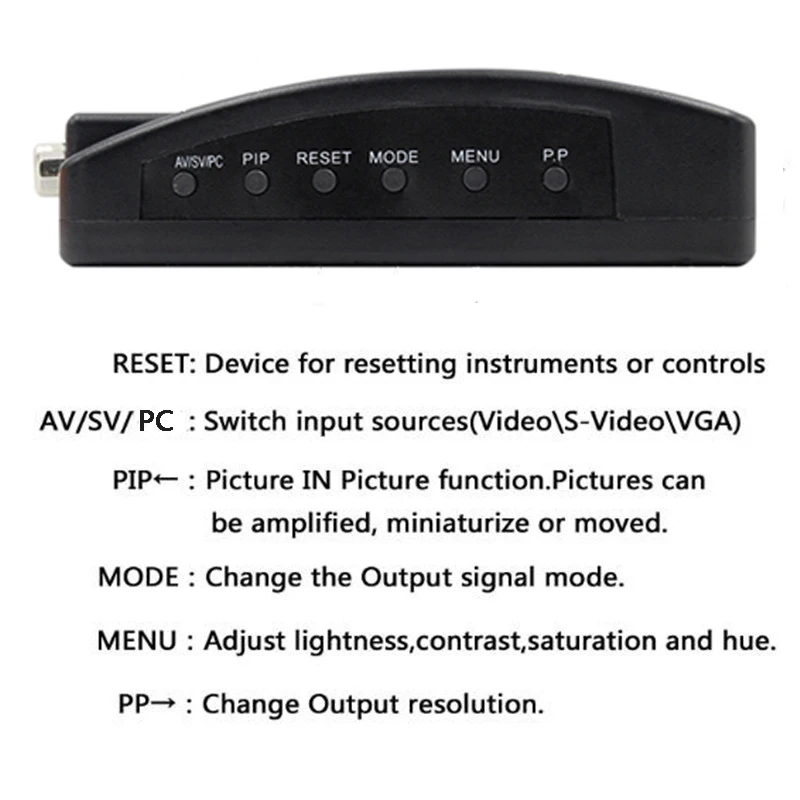 VGA, S-vídeo de 4 pines, entrada BNC; Salida VGA.Convierta VGA/S-video/BNC a VGA.Permita que DVD/DVR, televisión de circuito cerrado, cámara, etc. se muestren en un monitor de PC o LCD.Un solo botón para cambiar fácilmente entre diferentes fuentes de entrada."Entrada", "Menú", "Freeze/+", botón de función "Resolución/-".Entrada, brillo, contrato, saturación y tono ajustables.Resolución de salida VGA compatible: 800 x 600 / 60 HZ, 800 X 600 / 75 HZ, 1024 x 768 / 60 HZ, 1280 x 1024 / HZ.Detective automática PAL/NTSC.Función de congelación de imágenes.Función OSD (On-Screen-Display).Guardar automáticamente la configuración y el estado de funcionamiento cuando se apaga.