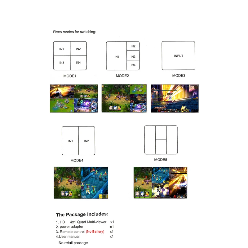 Puede mostrar 4 señales de vídeo digital HDMI en la misma pantalla, y tiene una variedad de segmentación de vídeo, conmutación sin interrupciones 4 señales de entrada HDMI sincrónicamente. Los métodos de control del interruptor son flexibles, se pueden cambiar a través de