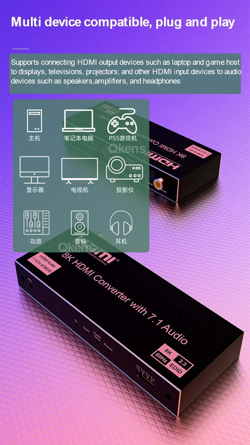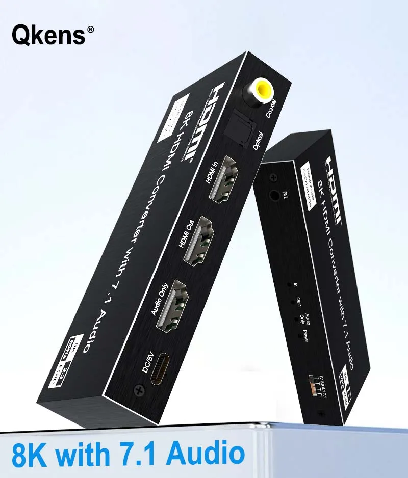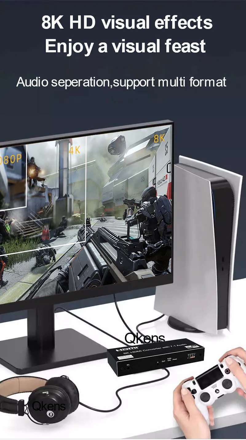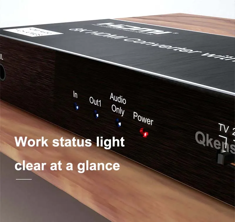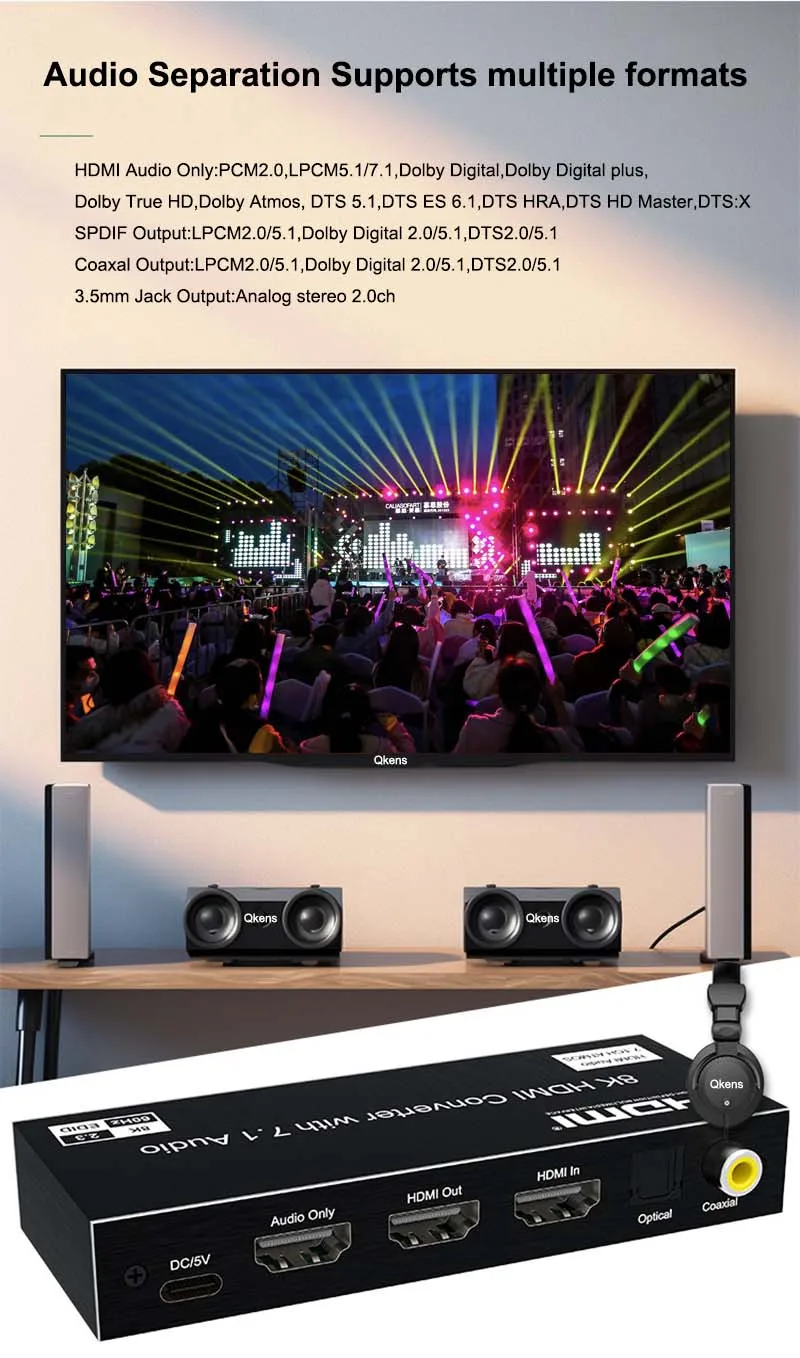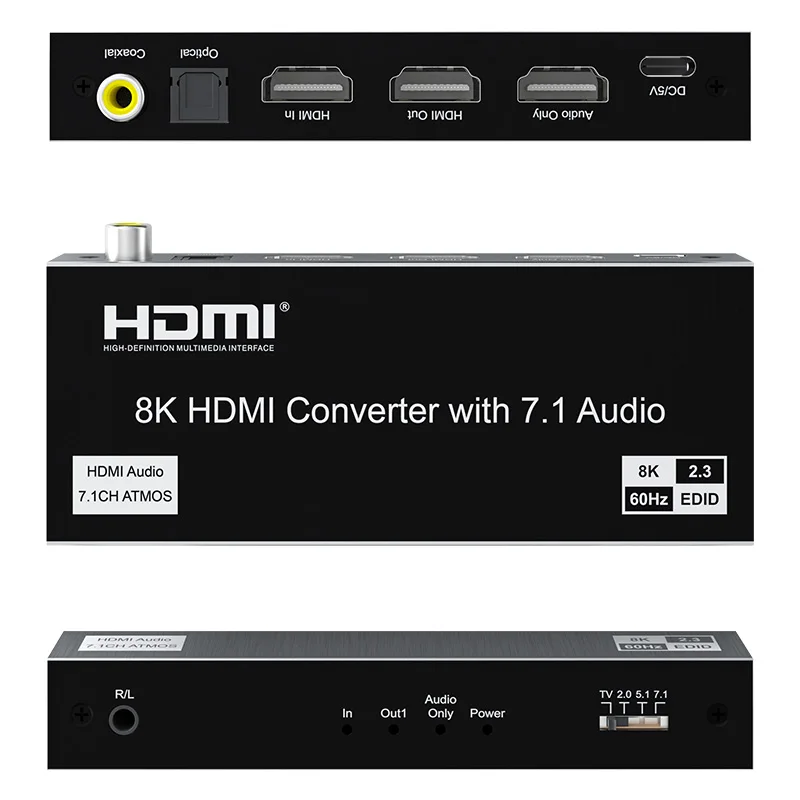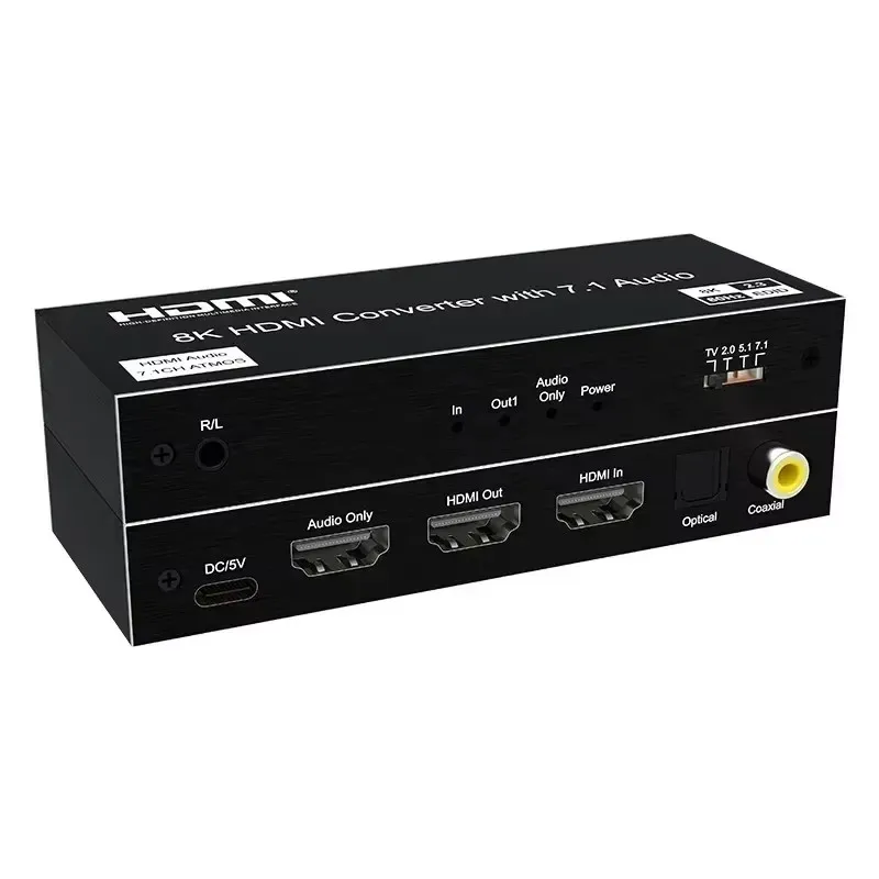 Este convertidor de audio HDMI de 8K convierte la señal de vídeo HDMI en visor/proyector, el digital separado Salida de señal de audio (solo HDMI AUDIO o óptica y coaxial) al amplificador o altavoz, el separado Salida de señal de audio analógica al auricular, para que se puedan separar audio y vídeo. La resolución de este convertidor de audio puede ser de hasta 8K/60Hz.