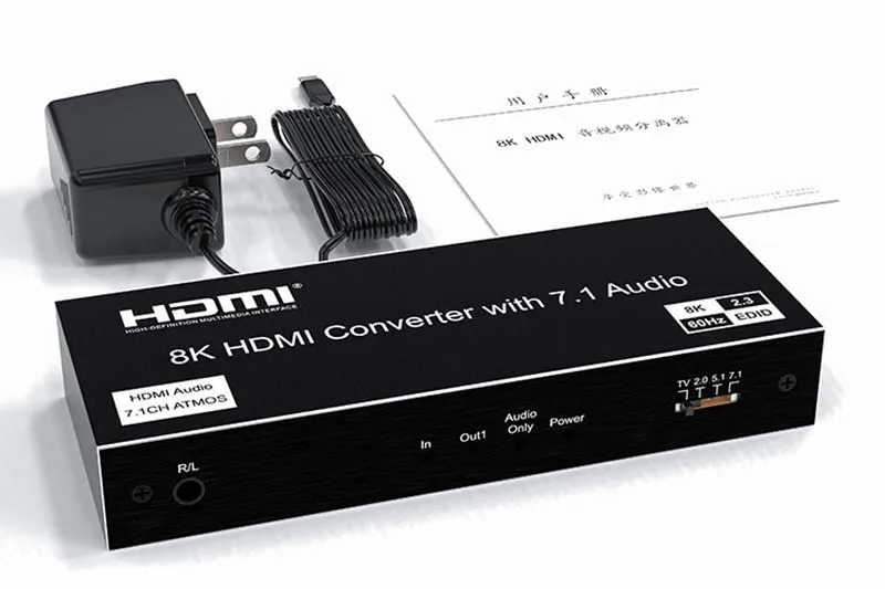 Convertidor HDMI 8K con Audio 7.1 x1 Adaptador de corriente 5V/1A (puerto tipo C) x1 Manual de usuario x1 Sin caja de venta al por menor ni otros accesorios, si es necesario, contáctenos antes de comprar.