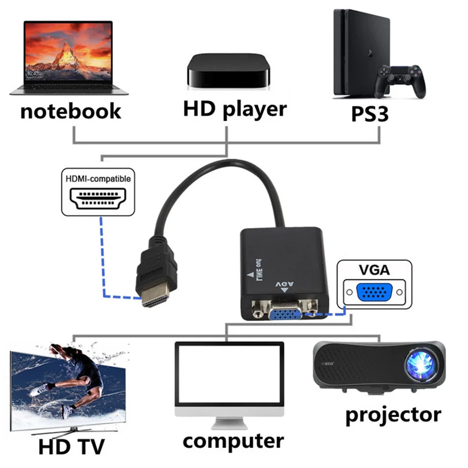 1 este convertidor HDMI compatible con VGA, la señal VGA de salida se puede enviar a la pantalla CRT/LED y al proyector, etc., la señal de entrada compatible con HDMI se puede conectar para PS3, para XBOX360,. Se pueden volver a unir DVD con luz azul, decodificador HD y otras salidas VGA.