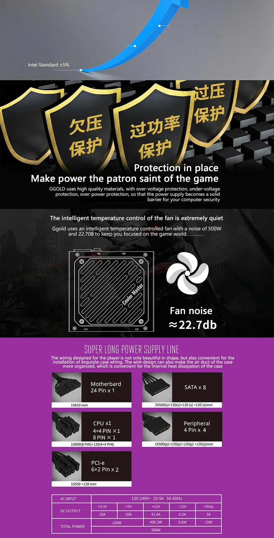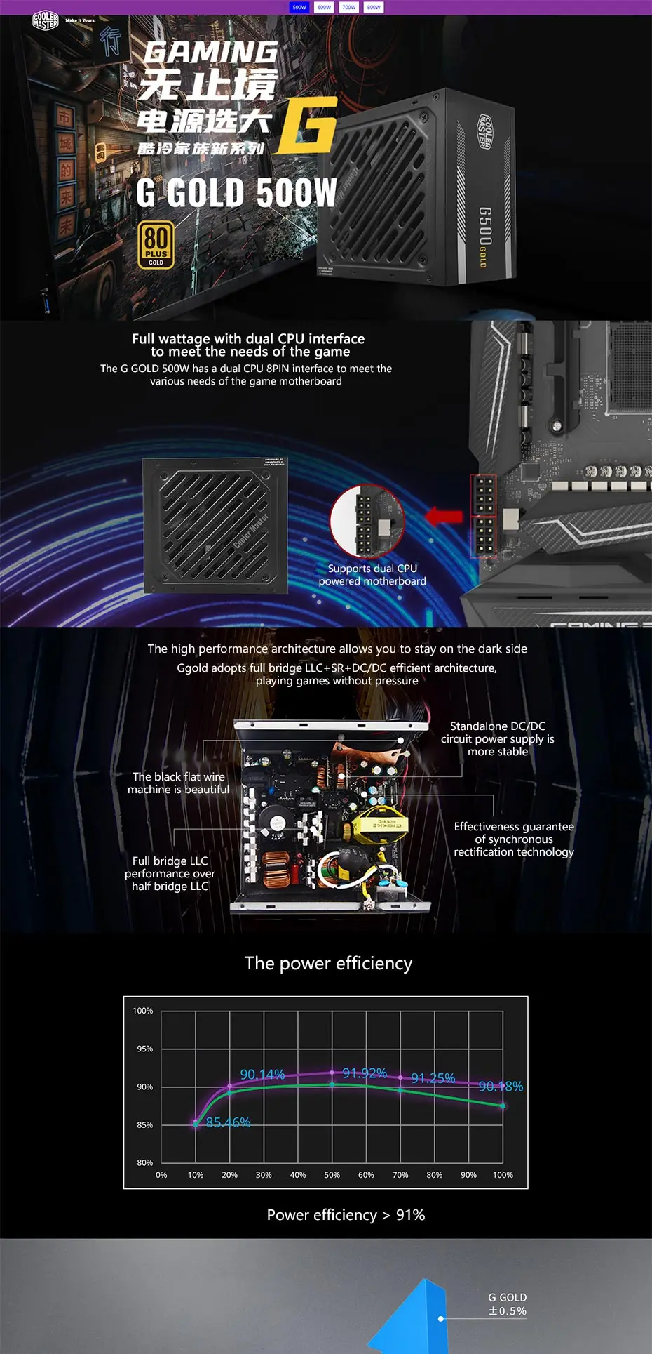 Comprar Cooler Master-fuente de alimentación dorada G500/G600/G700 para juegos de ordenador, 500/600/700 vatios, 12V, CPU dual, interfaz de 8 pines con ventilador deslizante de 120mm