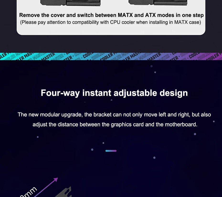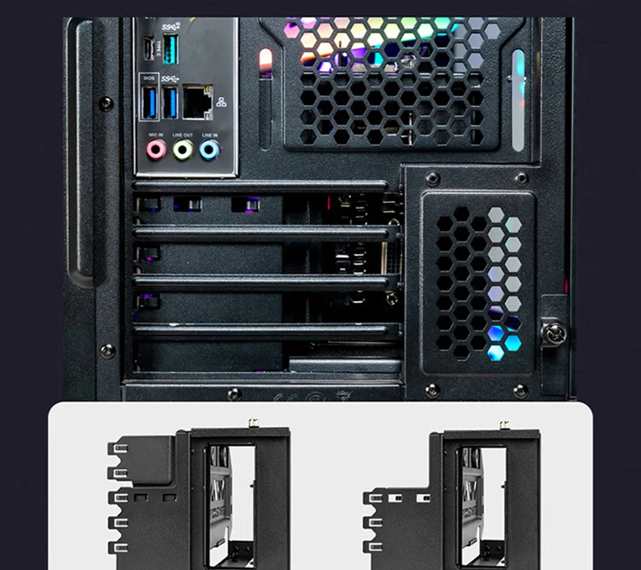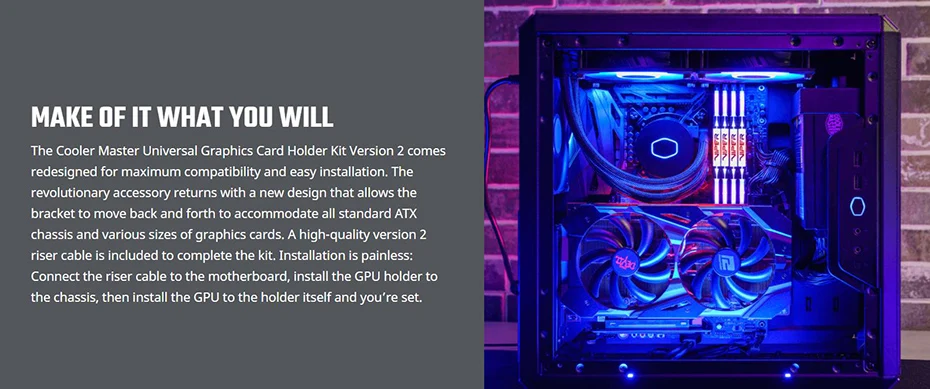 NOTE :This product is only compatible for devices that support the PCI-E 3.0 specification. If you use this product with a motherboard that supports PCI-E 4.0, please enter into BIOS option and select PCI-E 3.0 before installation., The Vertical GPU Holder Kit V2 can also accommodate 3-slots GPUs but allows installation of only 2 screws out of 3