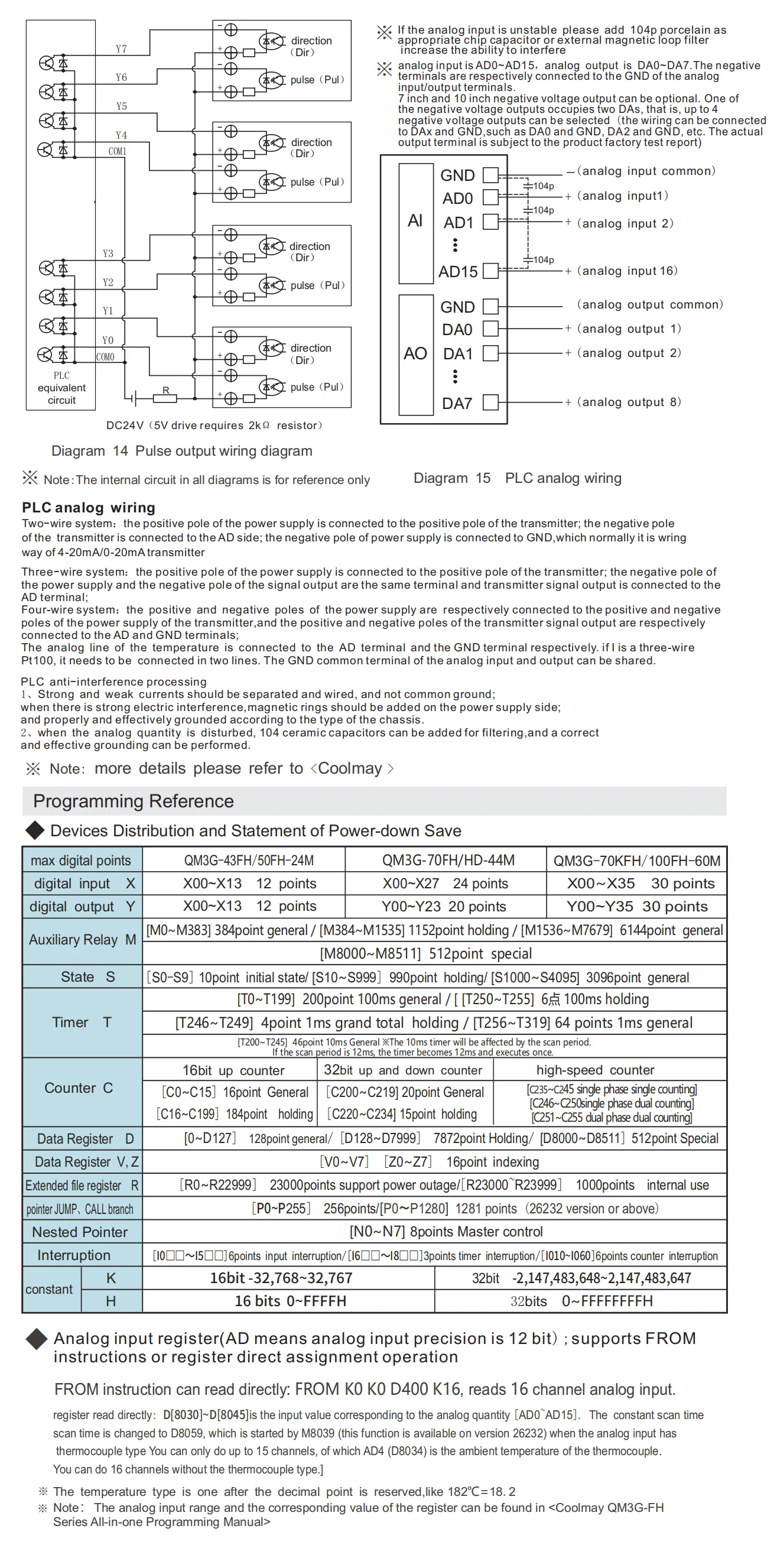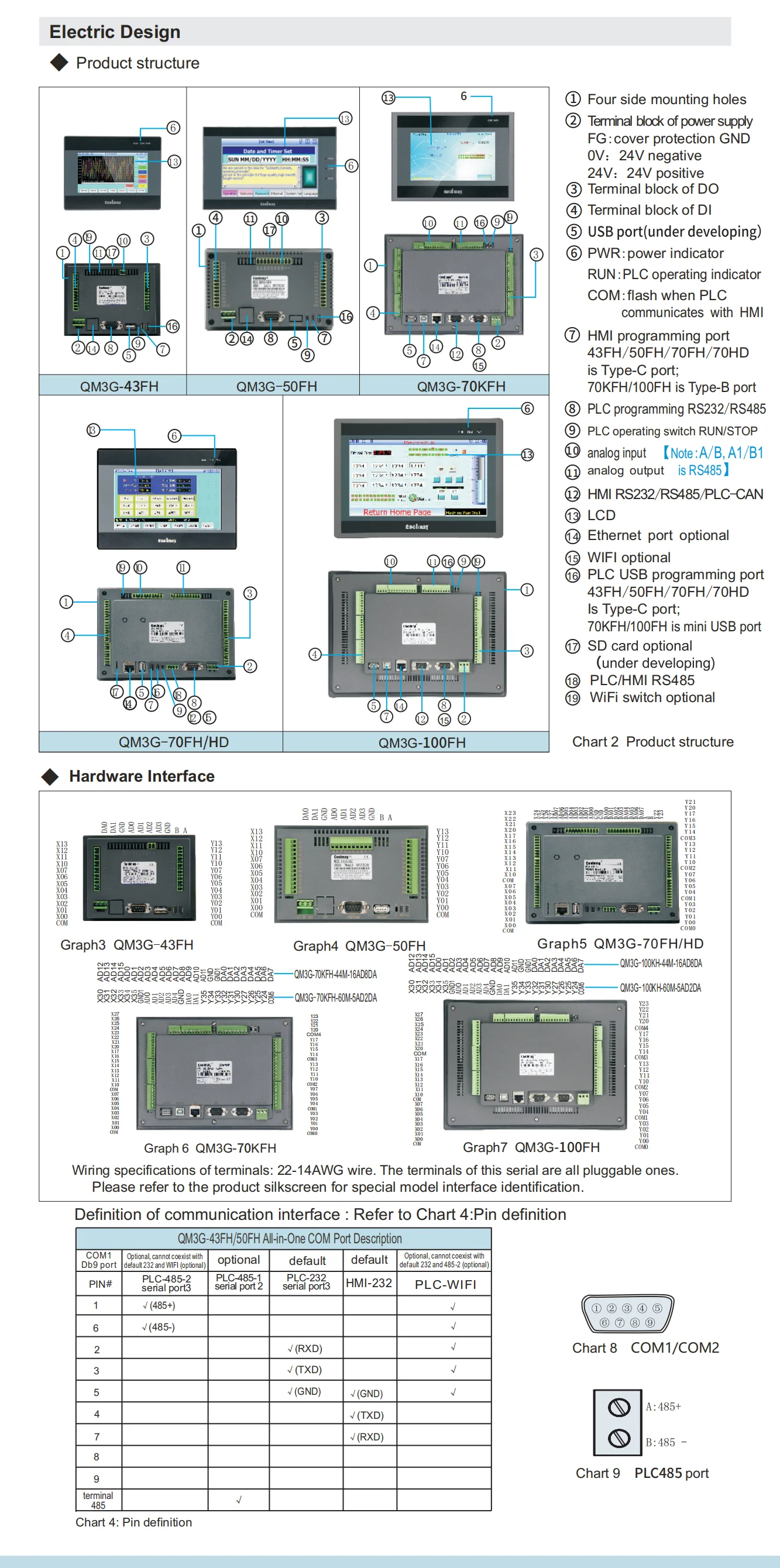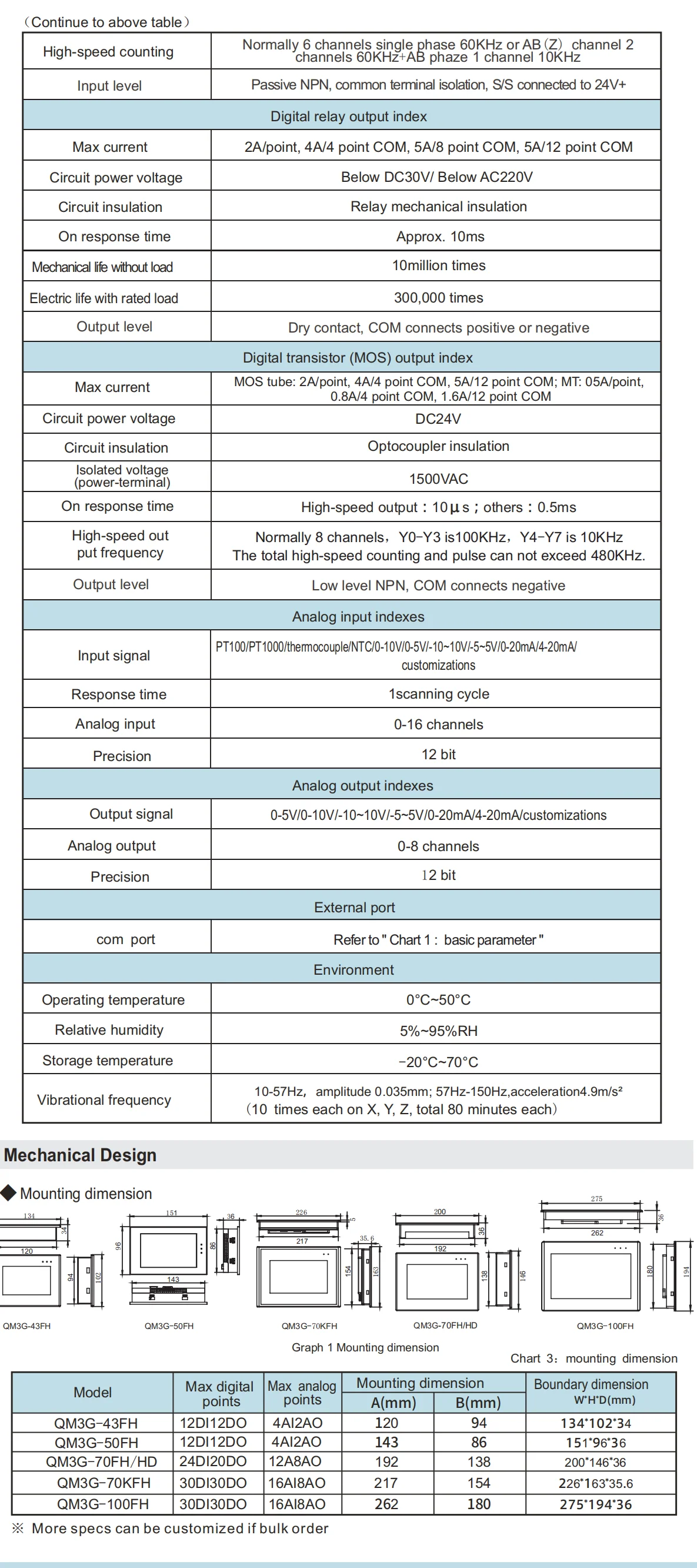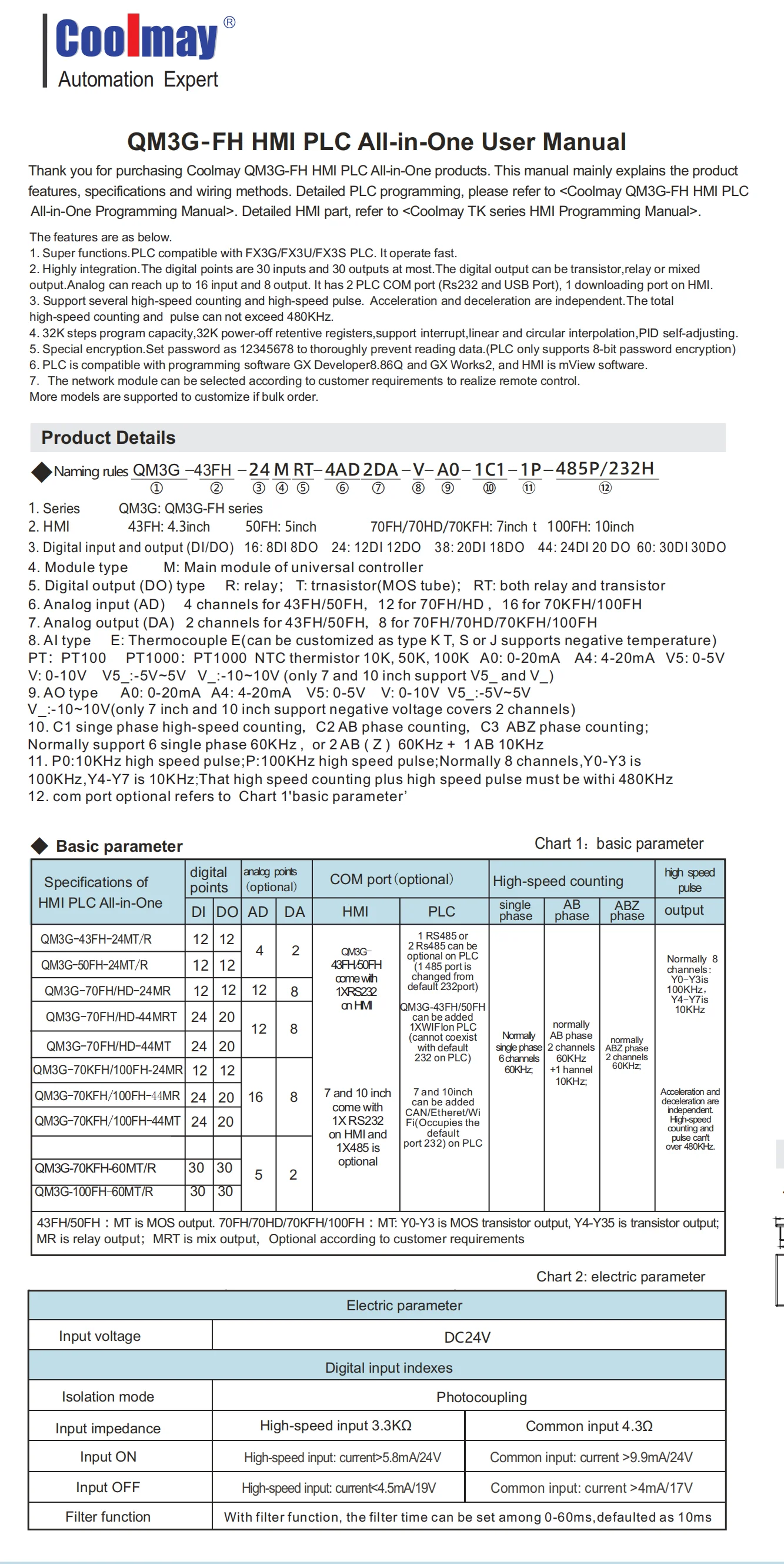 QM3G-50FH-24MT:5PLC HMI de pulgadas todo en uno, 12DI 12DO, salidas de transistor,Opcional máximo 4 entradas analógicas y 2 salidas analógicas,1 RS232,1RS485,4 Salida de pulso de alta velocidad (100 KHz, Y0-Y3), 4 Salida de pulso de alta velocidad (10 KHz, Y4-Y7).