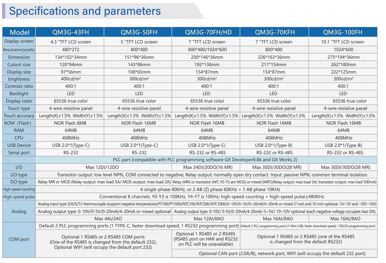 QM3G-100FH-60MR:7PLC HMI de pulgadas todo en uno, 30DI 30 PUNTAS,Opcional máximo 5 entradas analógicas y 2 salidas analógicas,1 RS232,1RS485.