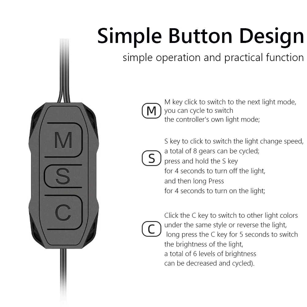 Haga clic en M para cambiar al siguiente modo de iluminación, que puede alternar para cambiar el modo de iluminación del controlador; haga clic en S para cambiar la velocidad de cambio de luz. Hay 8 marchas que se pueden cambiar circularmente; Mantenga presionada la tecla S durante 4 segundos para apagar la luz, y luego mantenga presionada durante 4 segundos para encender la luz; haga clic en la tecla C para cambiar a otros colores de luz con el mismo patrón o la luz se invierte. Mantenga presionada la tecla C durante 5 segundos para cambiar el brillo de la luz. Se puede reducir el brillo de 6 marchas en total (cambio de ciclo).