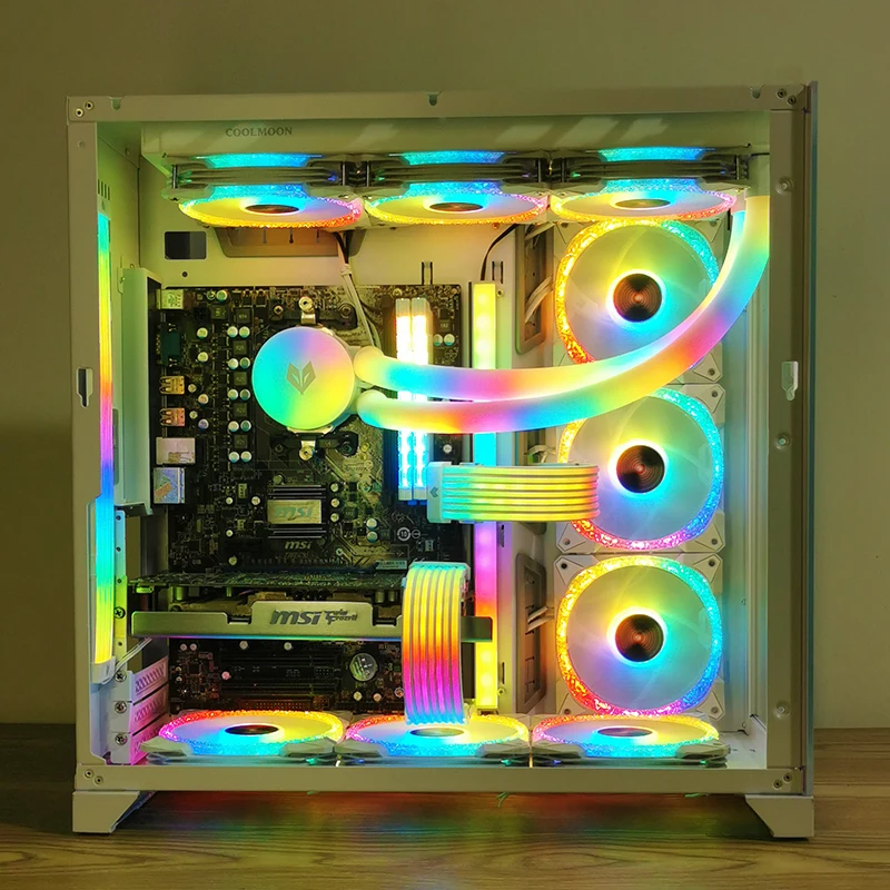 Interfaz: 5 V 3PIN * 2 + 4PIN (5 V 3-PIN hembra enchufe en la placa base 5 V ARGB interfaz Aura Sync, el macho de 5 V y 3 pines se conecta con otros productos ARGB de 5 V en serie para iluminar la luz; no se utiliza la interfaz tapa-PIN de protección de aislamiento, cubra la tapa para evitar cortocircuitos; Interfaz pequeña de 4 pines: Interfaz dedicada para el controlador de la marca COOLMOON (cuando la placa base no admite 5V ARGB, puede comprar el controlador Coolmoon para usarlo)