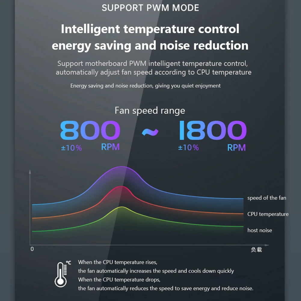 5. Control inteligente de temperatura, ahorro de energía y reducción de ruido:Admite el control de temperatura inteligente PWM de la placa base, ajusta automáticamente la velocidad del ventilador de acuerdo con la temperatura de la CPU, ahorra energía y reduce el ruido, lo que le brinda un disfrute tranquilo. El ventilador está equipado con 8 piezas de patas de goma, que pueden reducir eficazmente la vibración y el ruido, brindándole un disfrute tranquilo y cómodo.