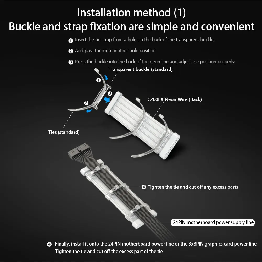 Finalmente, instálelo en la línea de alimentación de la placa base de 24 pines o en la línea de alimentación de la tarjeta gráfica de 3X8 pines, apriete la correa de amarre y corte el exceso de la correa de amarre.Nota: