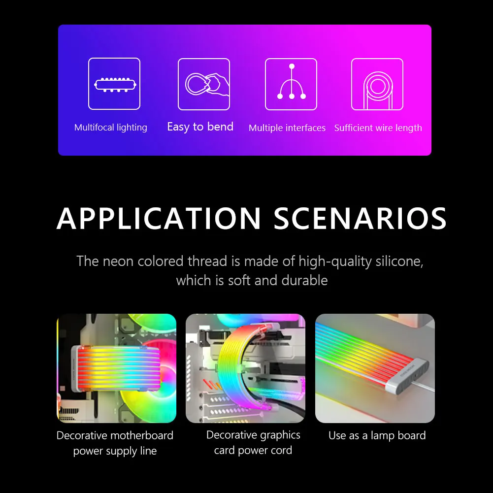 4.LED ARGB a todo color de alta densidad:Nuestro cable de extensión incorpora 56/36 LED ARGB a todo color de alta densidad.A través de la tira guía de luz de silicona de alta fidelidad, las luces emiten un suave efecto dimensional 3D, brindando colores vibrantes y una iluminación visualmente agradable.Los conectores 5V 3PIN*2+4PIN permiten un cableado conveniente y mejoran la compatibilidad del producto.