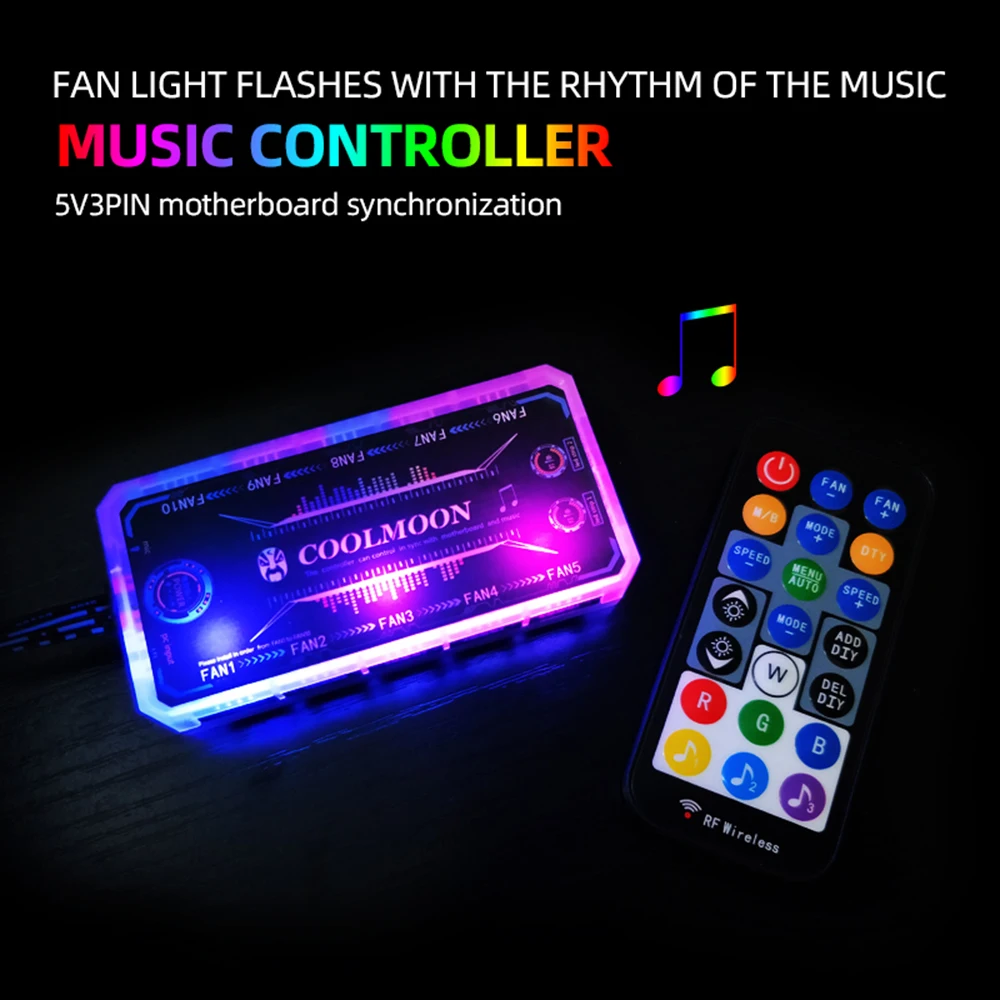Además de la mayoría de las funciones de un controlador normal, este controlador de música inteligente Coolmoon ha agregado 3 modos de música y admite la placa base de 5 V y 3 pines AURA SYNC.Voltaje de entrada del ventilador de 6 pines: 12 V 4 tiras de luz de 4 pines Voltaje de entrada: 5 V Control remoto Frecuencia RF: 433,92 Mhz Corriente máxima compatible: 10 A Potencia máxima compatible: 60 W