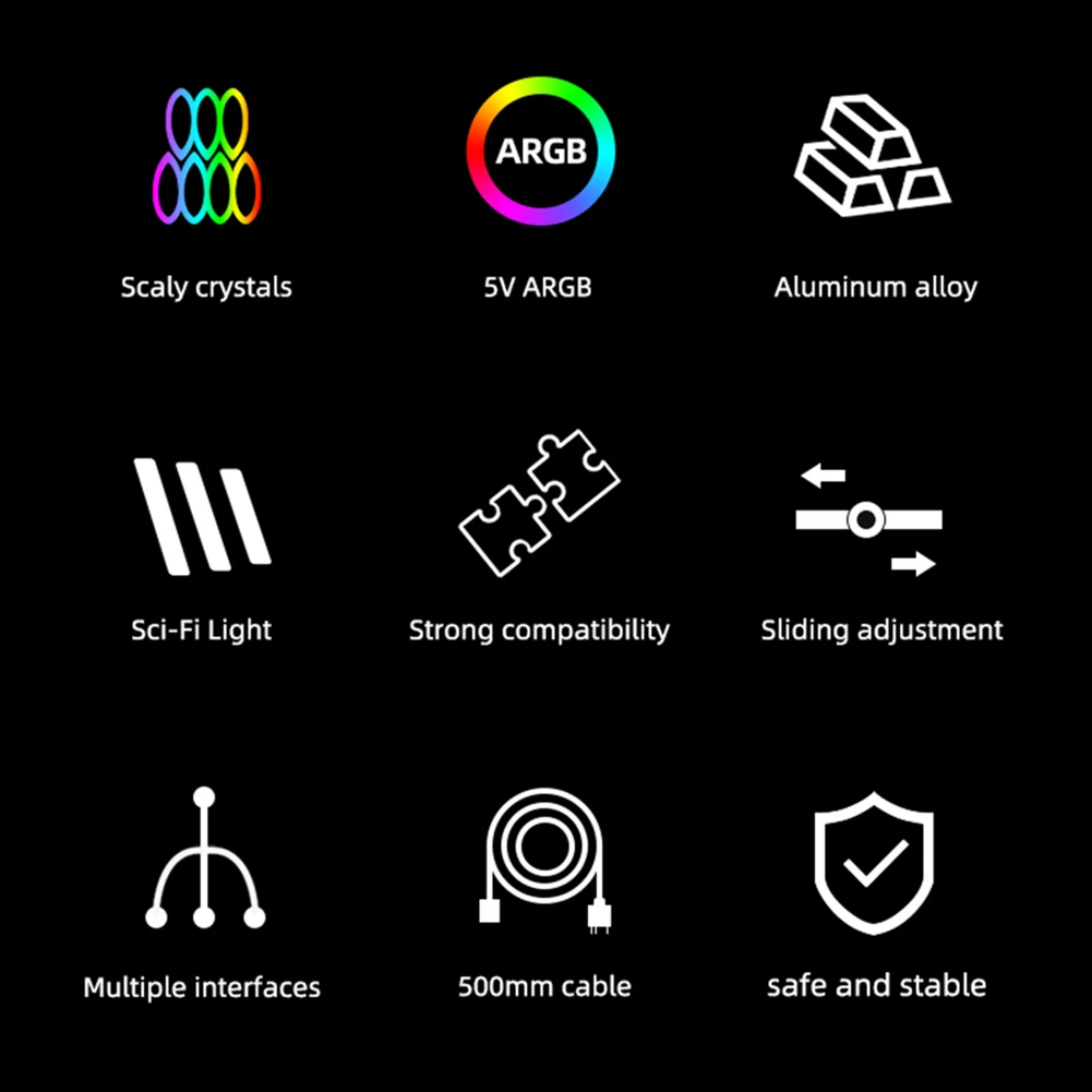 8. Sincronización de luz divina ARGB de 5V, disfrute de 16,8 millones de efectos de luz fríos. Soporte para ASUS, para MSI, para GIGABYTE, para ASRock y otras placas base direccionables (5V) ARGB sincronización de luz divina, software programable para personalizar 16,8 millones de colores de efectos de luz fría.