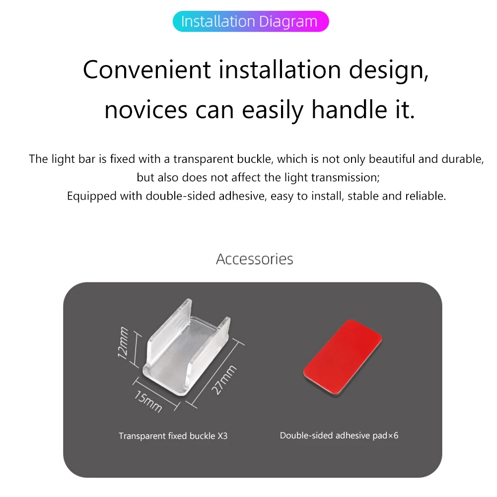 9. La barra de luz se fija con una hebilla transparente, que no solo es hermosa y duradera, sino que tampoco afecta la transmisión de luz; está equipado con adhesivo de doble cara, que es simple, estable y fiable.