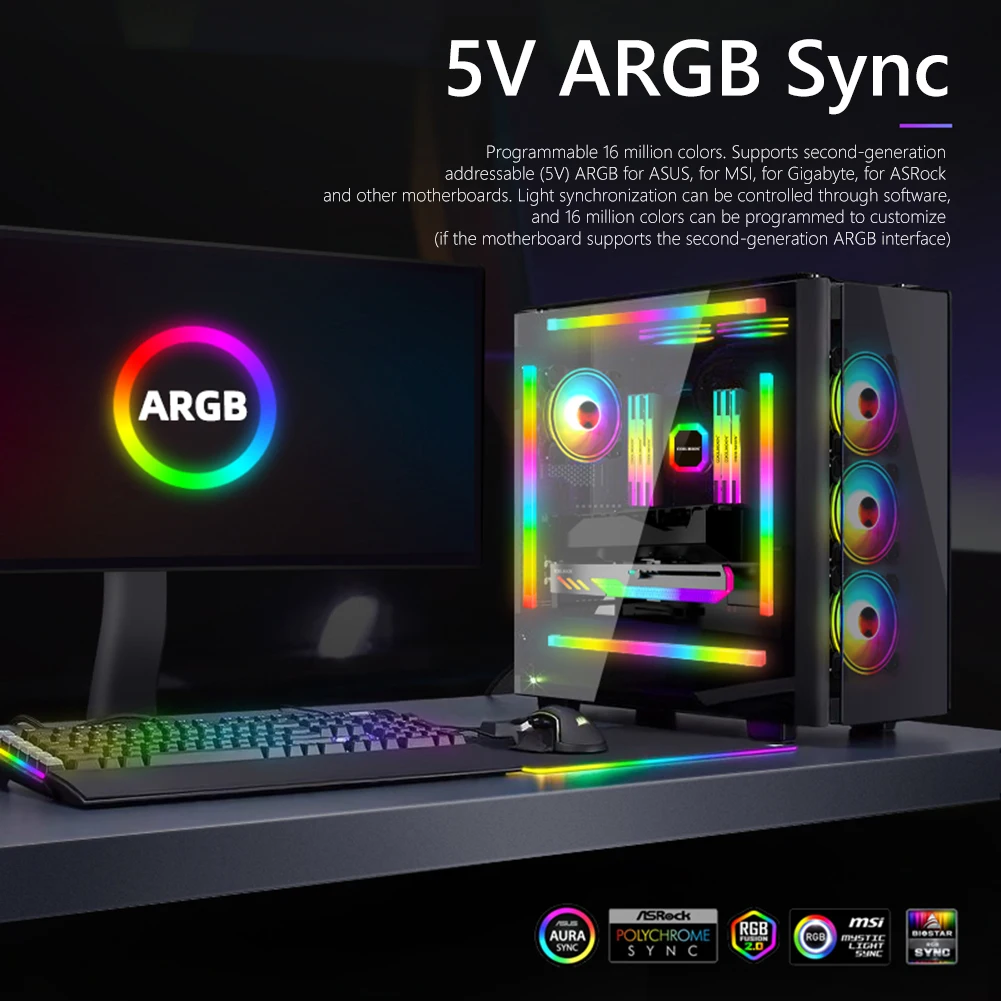 4. 5V ARGB AURASYNC, programable 16 millones de colores. Es compatible con el ARGB direccionable de segunda generación (5V) para ASUS/MSI/Gigabyte/ASRock y otras placas base. Puede controlar la sincronización de la luz a través del software y personalizar 16 millones de colores (si la placa base admite la interfaz de segunda generación ARGB)