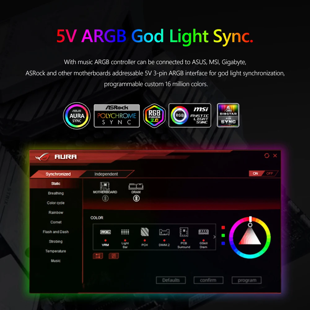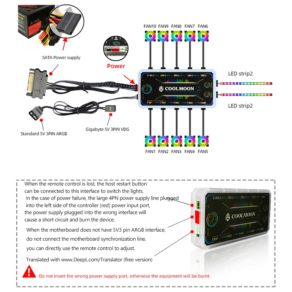 Este ventilador debe usarse con el controlador estándar/de música de 6 pines de nuestra marca para COOLMOON. Si desea realizar la función de sincronización de luz divina ARGB del ventilador, debe usarla con un controlador de música de la marca COOLMOON (El controlador ARGB de música tiene un micrófono incorporado. Puede detectar el sonido en el entorno y controlar la luz al ritmo con el sonido. (También puede hacer el ritmo de la música sin conectarse a la placa base); el controlador estándar no admite el ritmo de la música y la sincronización de la placa base, y puede controlar el color de la luz). Si no lo tiene claro, puede consultar nuestro Servicio de Atención al Cliente para solicitar el enlace del controlador.